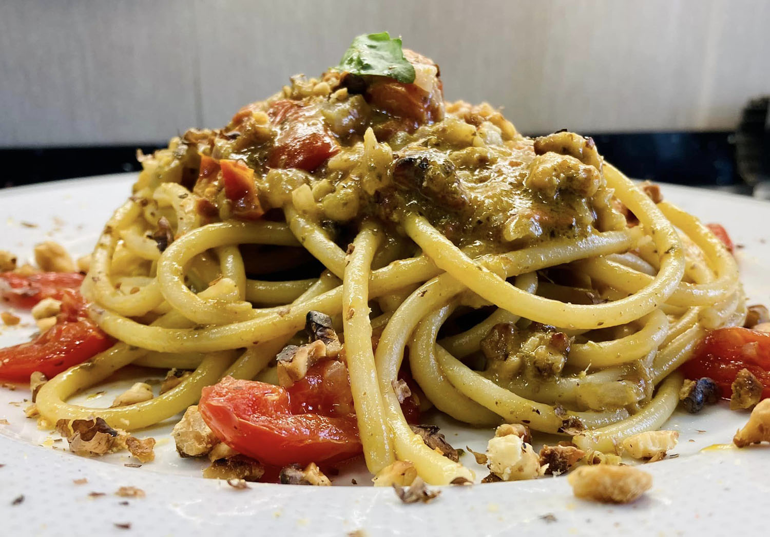 Gli spaghetti alla Cambusa, con le noci, il basilico e i pomodorini, rappresentano un primo piatto vegetariano davvero squisito. Questa gustosa ricetta celebra i prodotti della nostra terra, i quali, seppur semplici, sono profumati e saporiti. Ciò permettere di poter gustare dei piatti prelibati anche senza l’uso della carne e, quindi, dei vari sughi a base di carne come il ragù, la bolognese, la genovese. Si tratta di un primo molto fresco, saporito e perfetto anche per le calde giornate estive. Inoltre, potete preparare il sugo si prepara in pochissimo tempo cosicché potete salvare le vostre cene e i vostri pranzi quando andate di fretta.