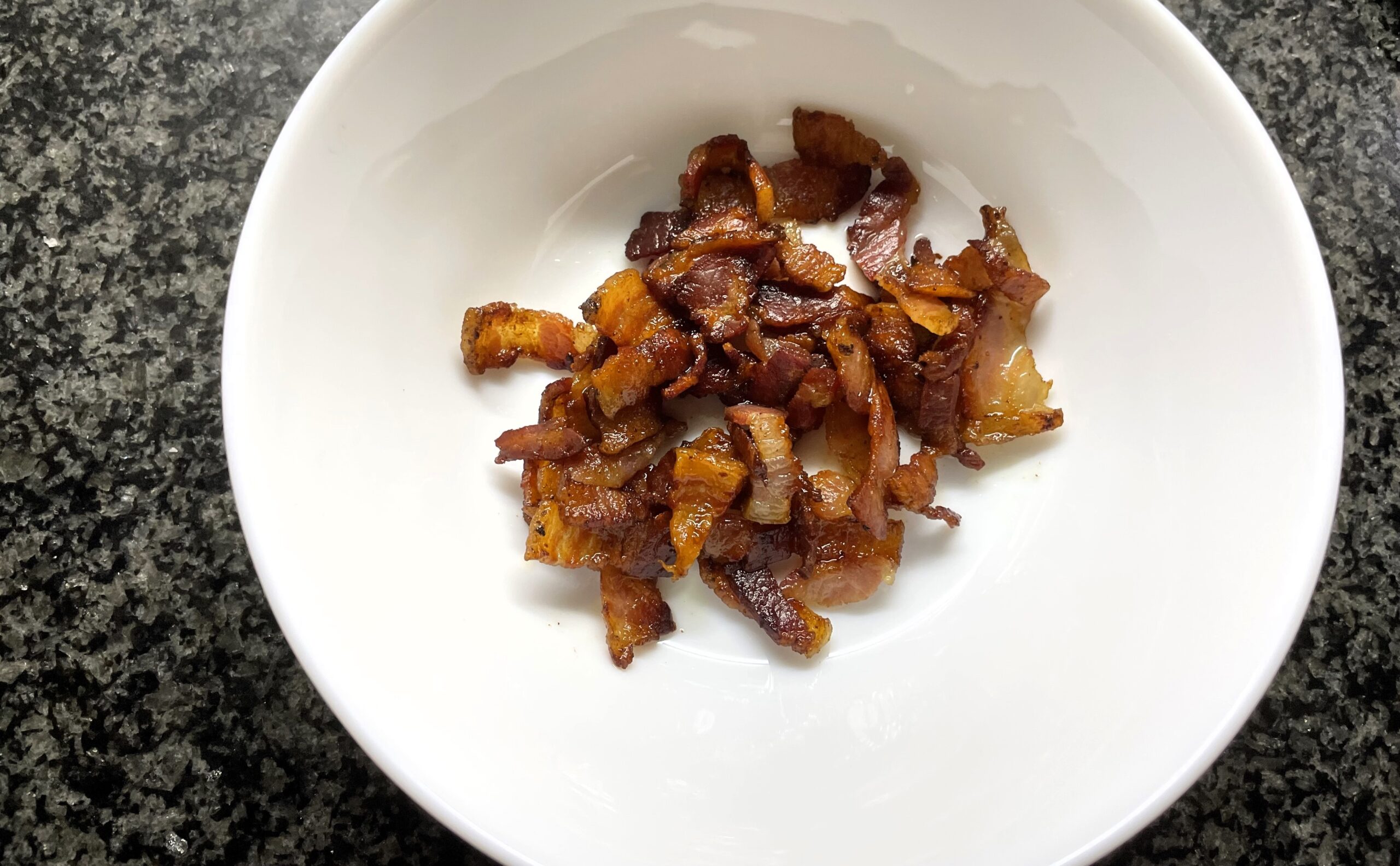 sempre mescolando. Impiattate, completando il piatto con la pancetta croccante.