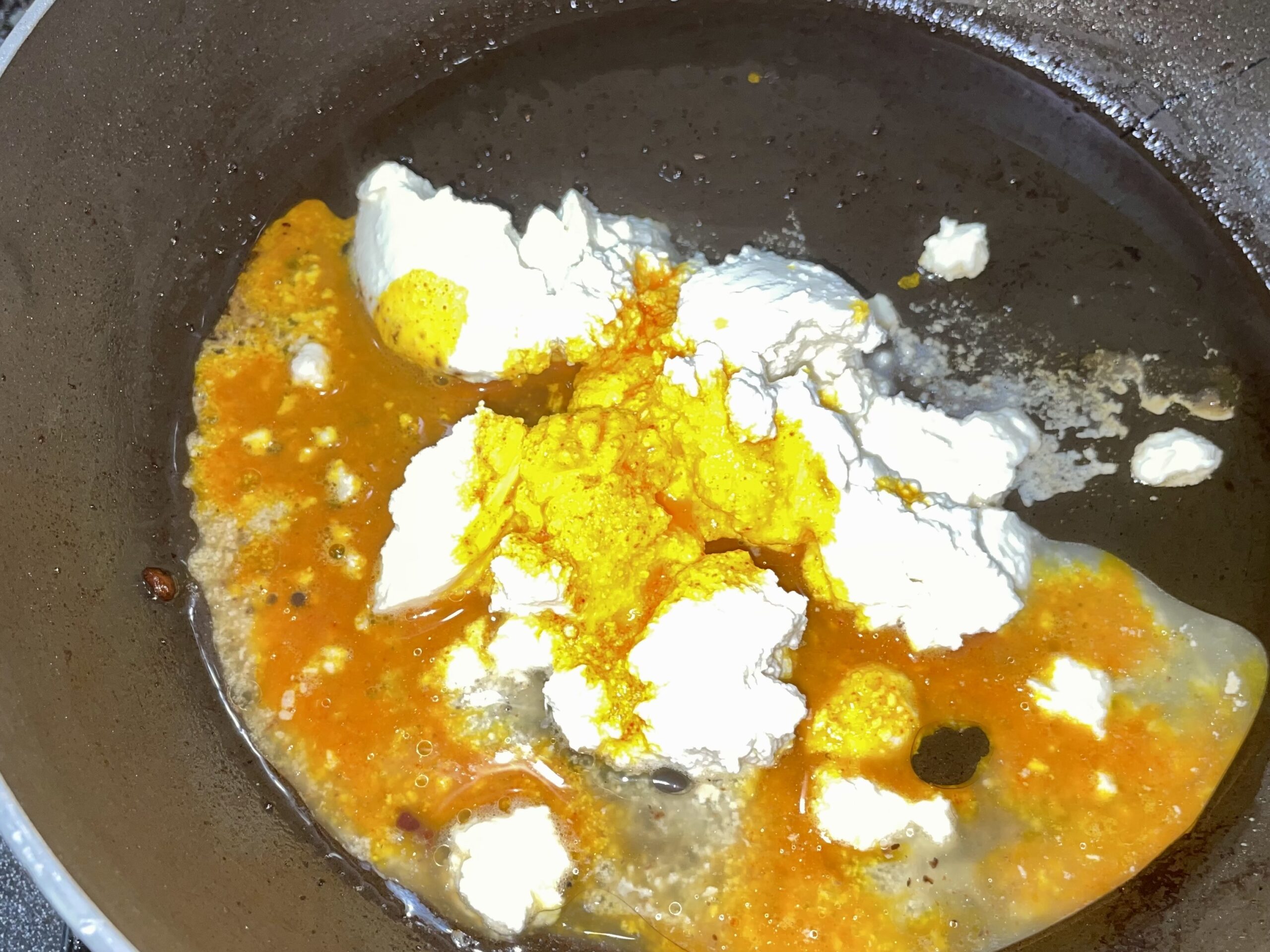 Nella stessa padella, unite la ricotta, poi aggiungete lo zafferano sciolto in un poco d’acqua, stemperate il tutto.