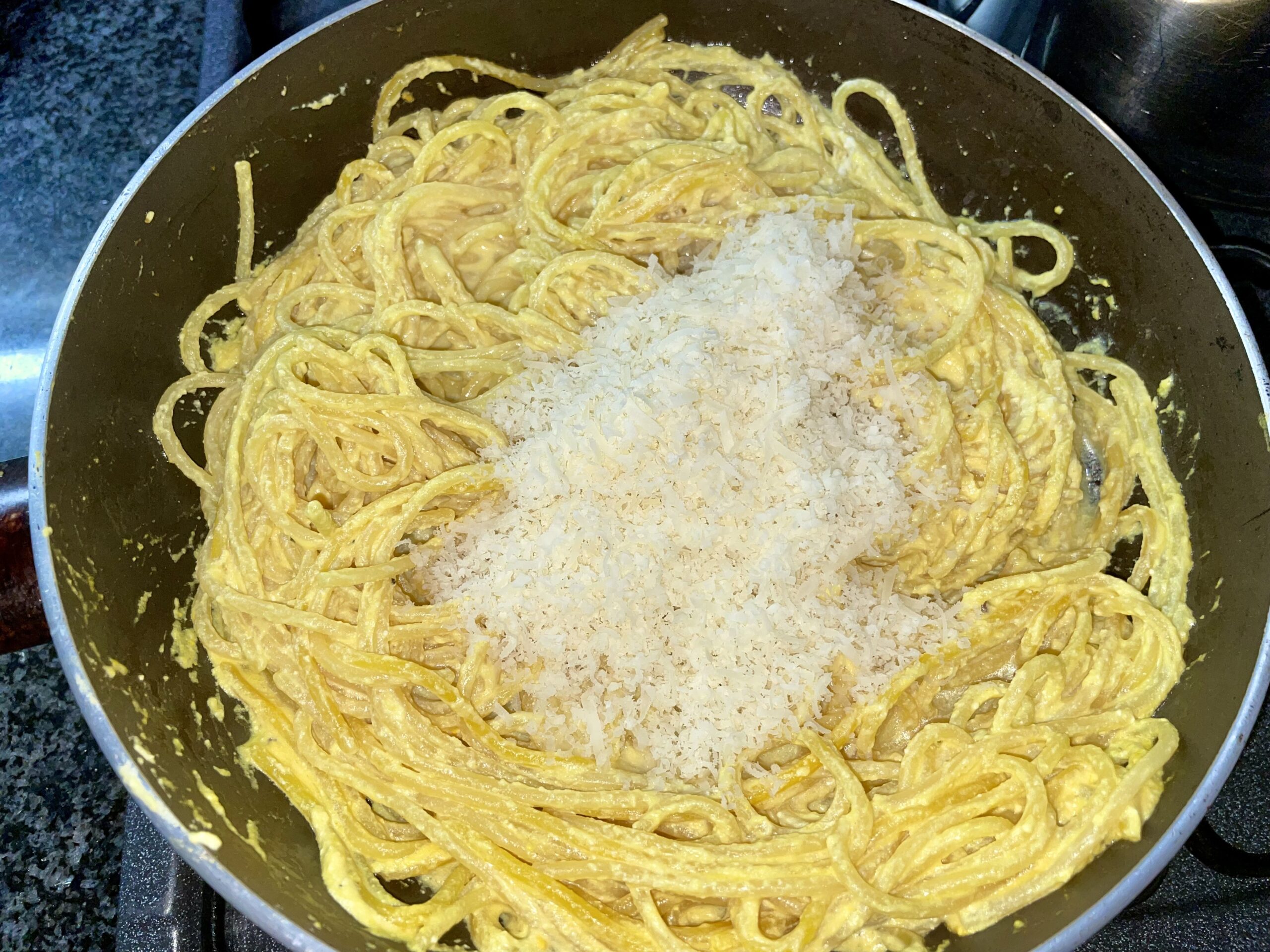 Cuocete la pasta al dente e colatela direttamente nella padella, mescolate bene, aggiungete il pecorino grattugiato,