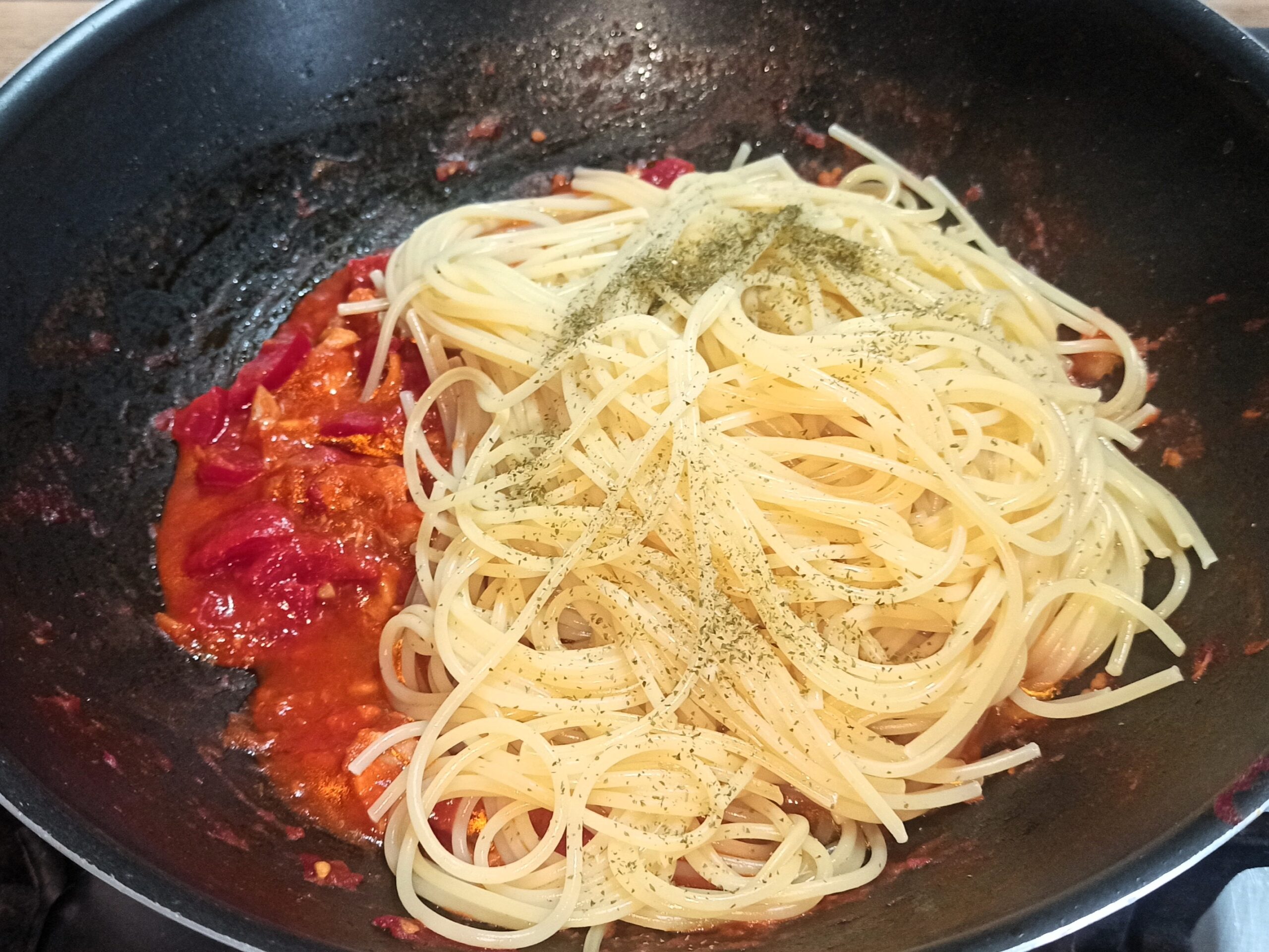 Cuocete la pasta al dente, e colatela direttamente nella padella, aggiungete ancora un poco di finocchietto selvatico tritato, mescolate, se occorre potete aggiungere un poco d’acqua di cottura.