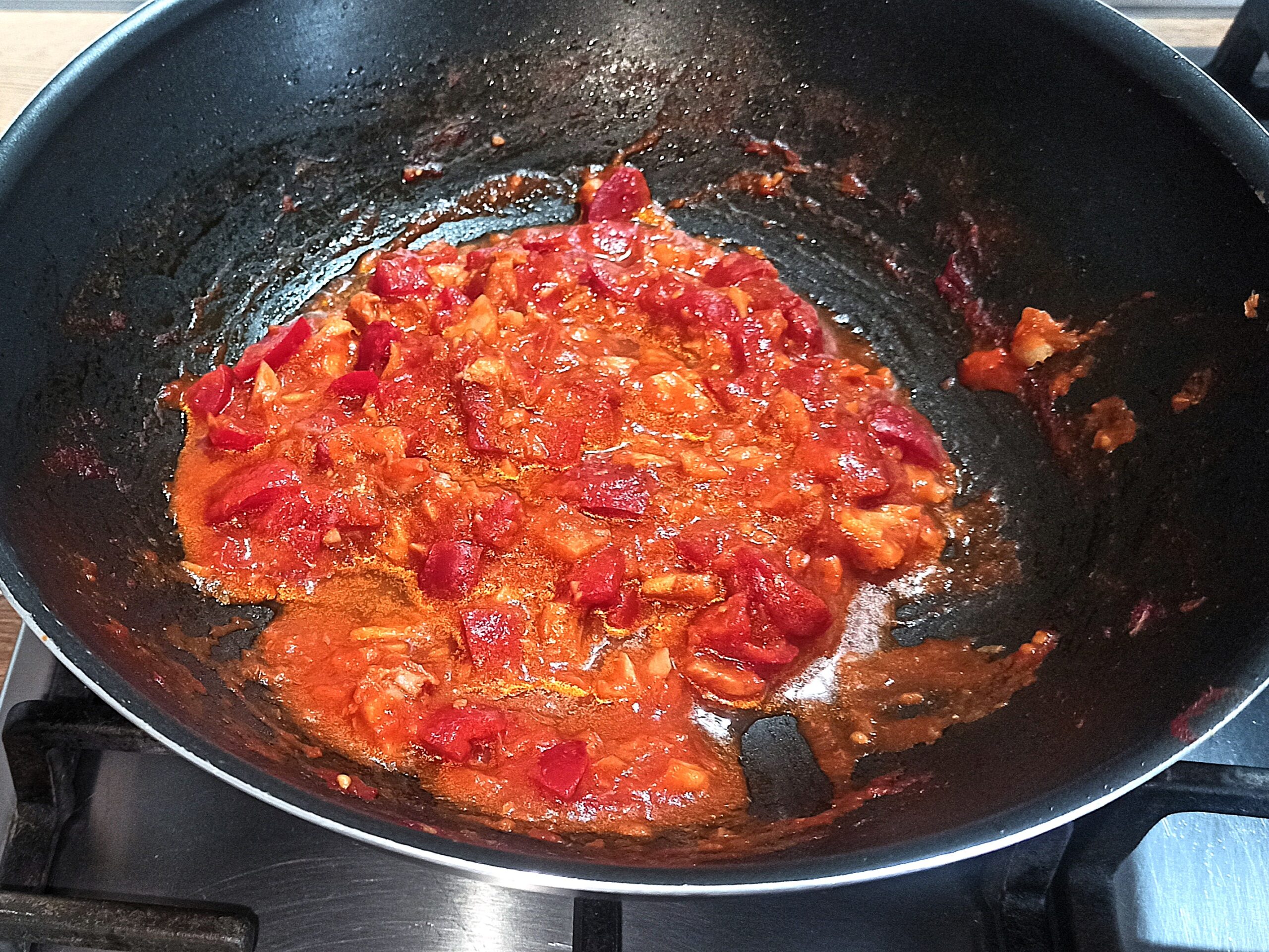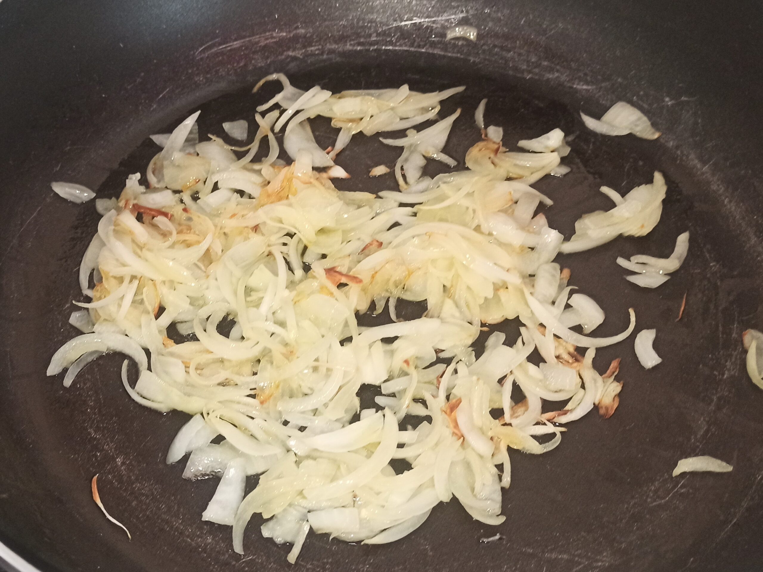 Per preparare la pasta con lo stoccafisso alla calabrese, iniziate ad affettare la cipolla, a fettine molto sottili. In una capiente padella, mettete un paio di giri d’olio evo, unite la cipolla, ed iniziate a farla ammorbidire a fuoco medio.