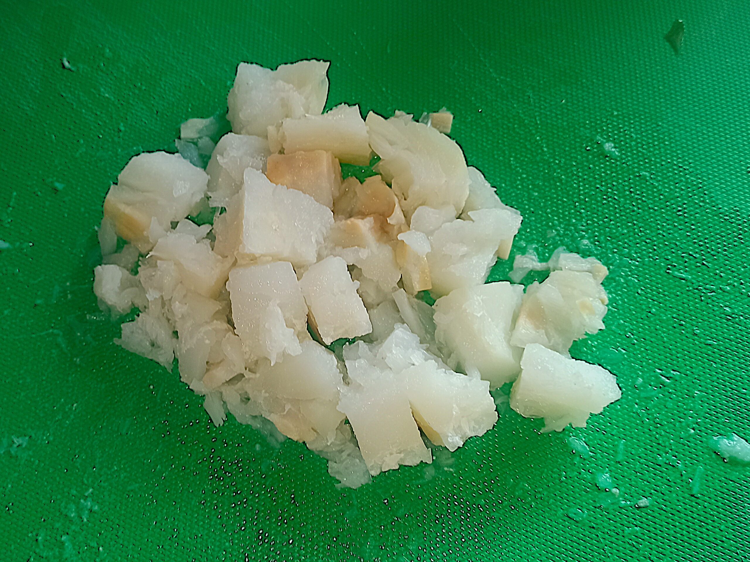 Eliminate la pelle dallo stoccafisso, e tagliatelo a tocchetti.
