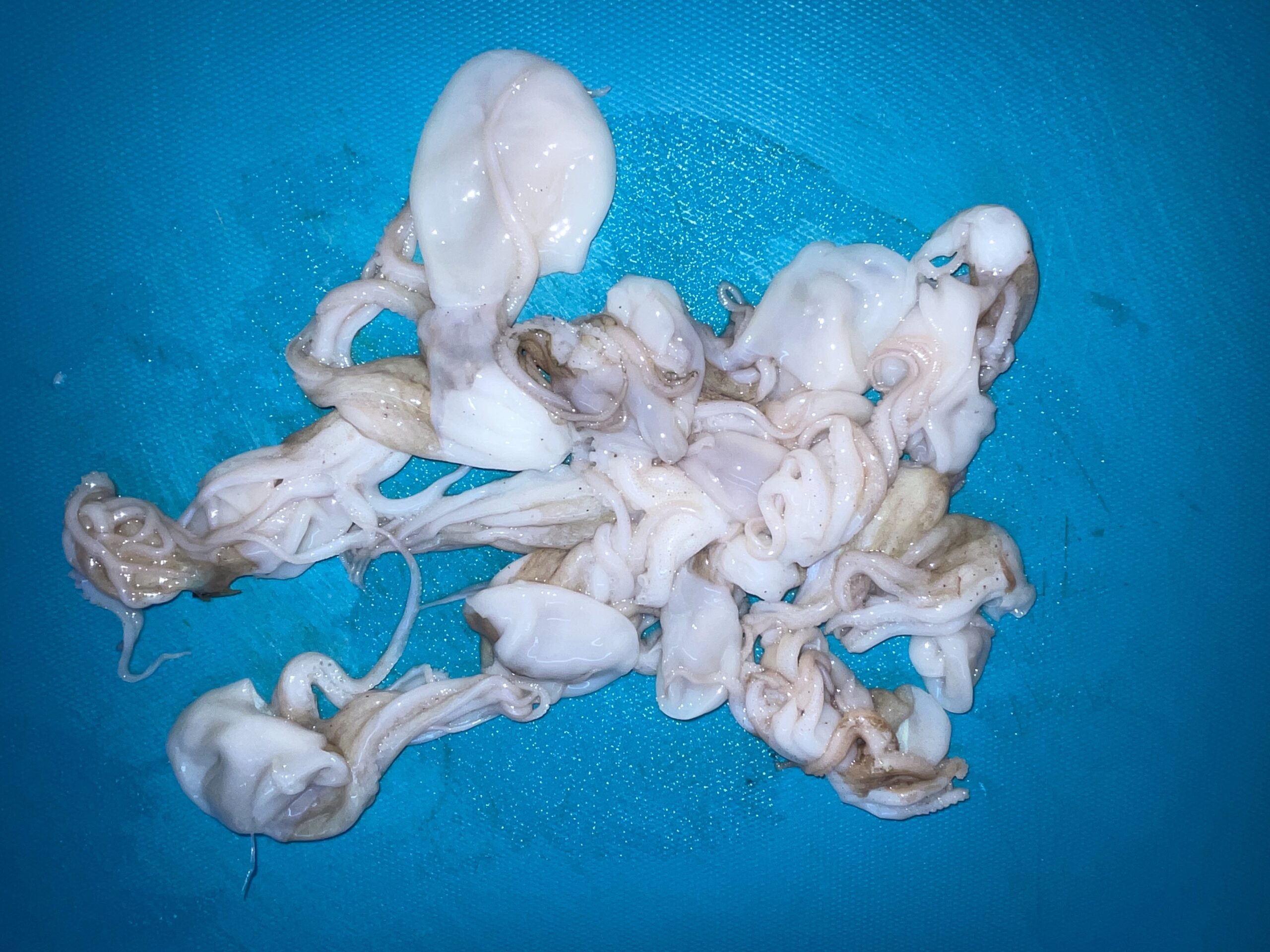 Per preparare gli spaghettoni con il sugo bicolore ai moscardini, iniziate a lavare e pulire i moscardini.