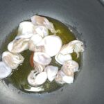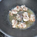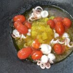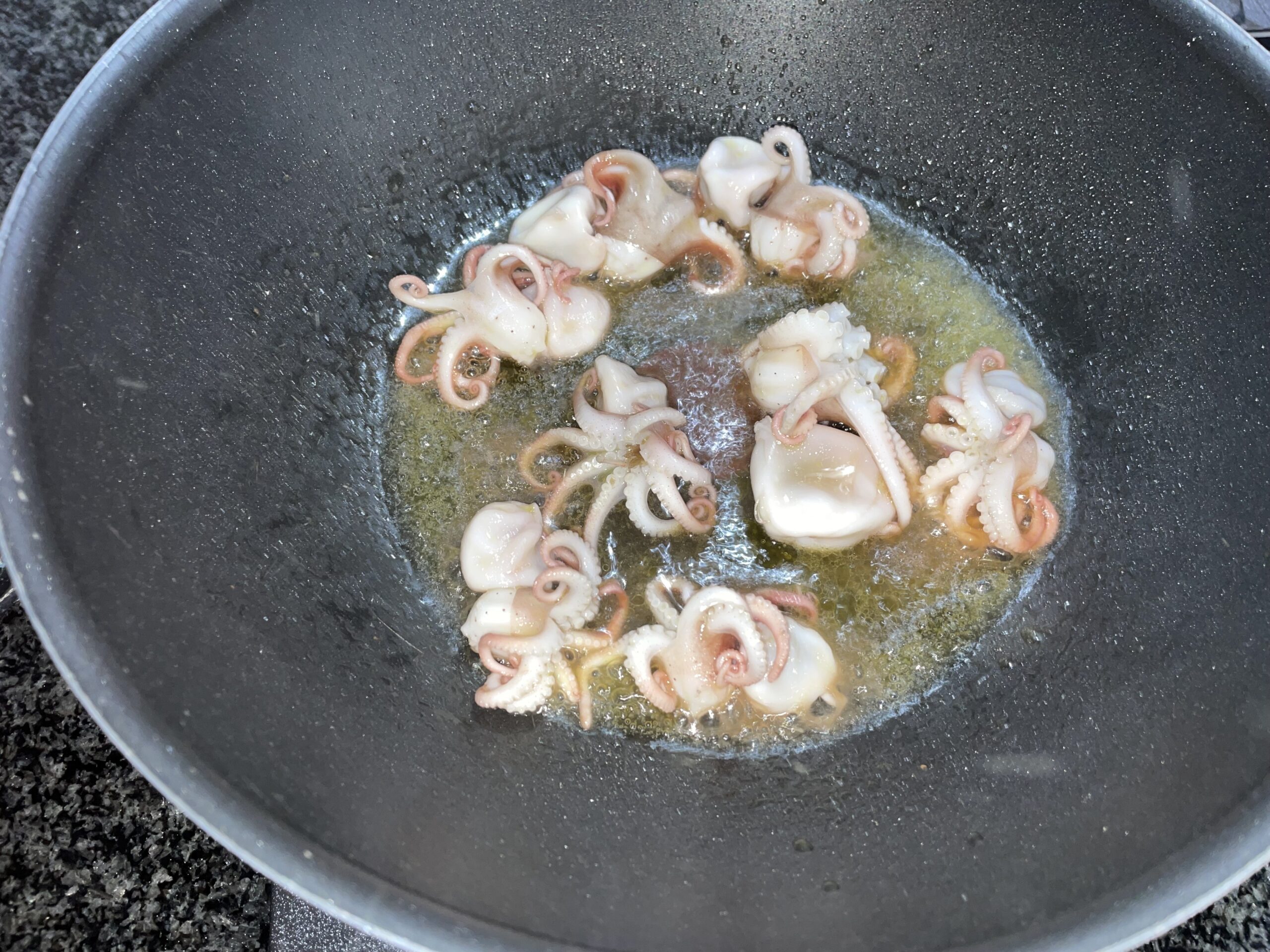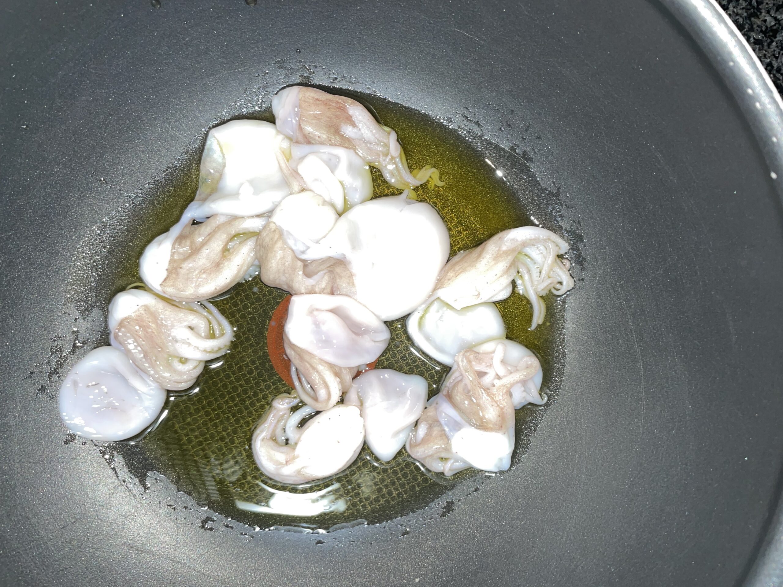 In una capiente padella mettete un paio di giri d’olio evo, fate imbiondire uno spicchi d’aglio ed eliminatelo. Aggiungete i moscardini,