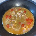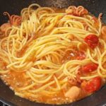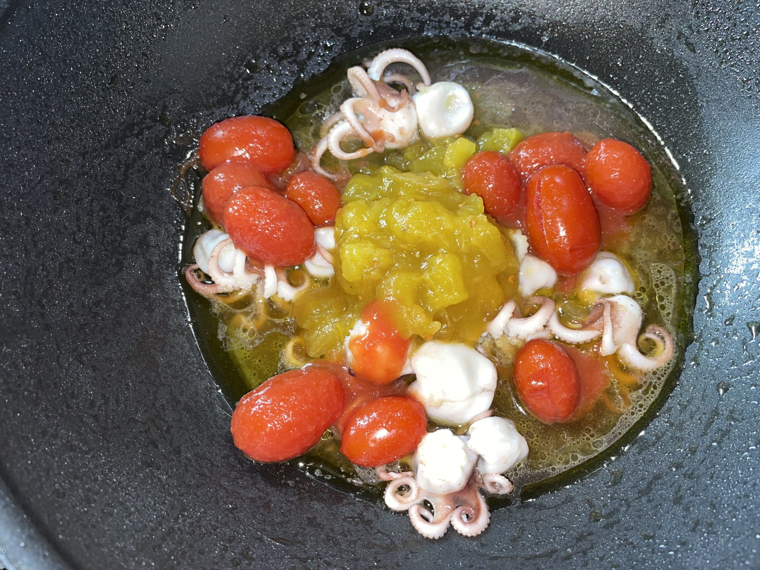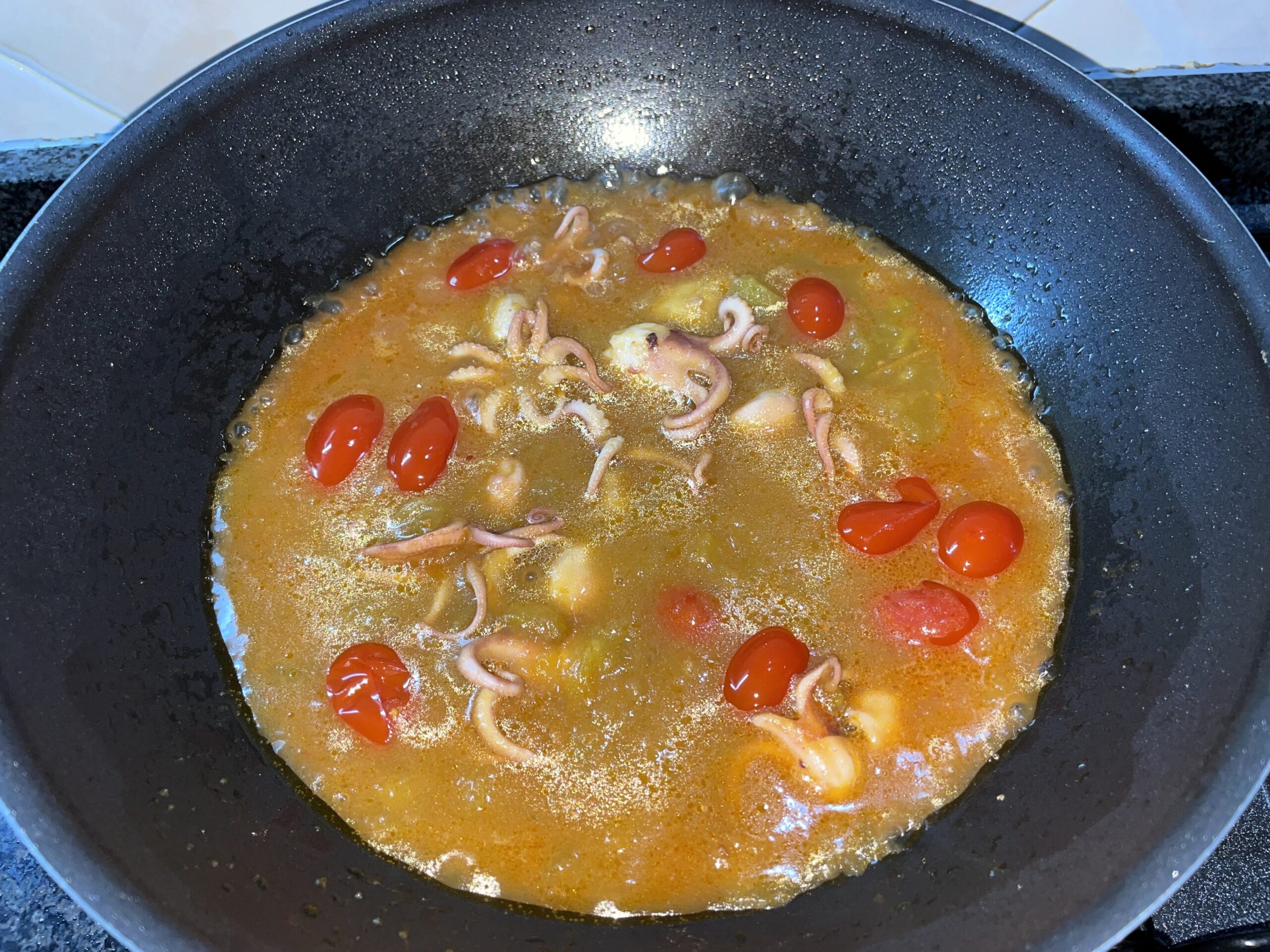 Appena l’alcol sarà evaporato aggiungete i pomodorini rossi e la polpa di quelli gialli.