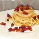 Colate la pasta nella padella, mescolatela bene con il fondo di cottura, poi unite la crema di pecorino, aggiungete ancora un poco d’acqua di cottura, e mescolate in modo da ottenere un condimento cremoso. Impiattate , completando con il guanciale croccante e il pepe macinato al momento.