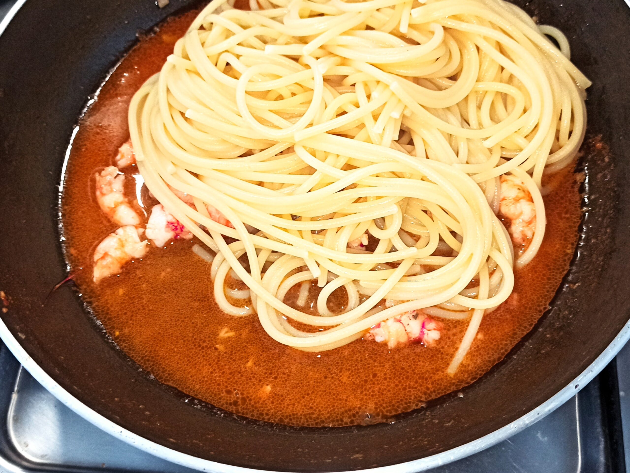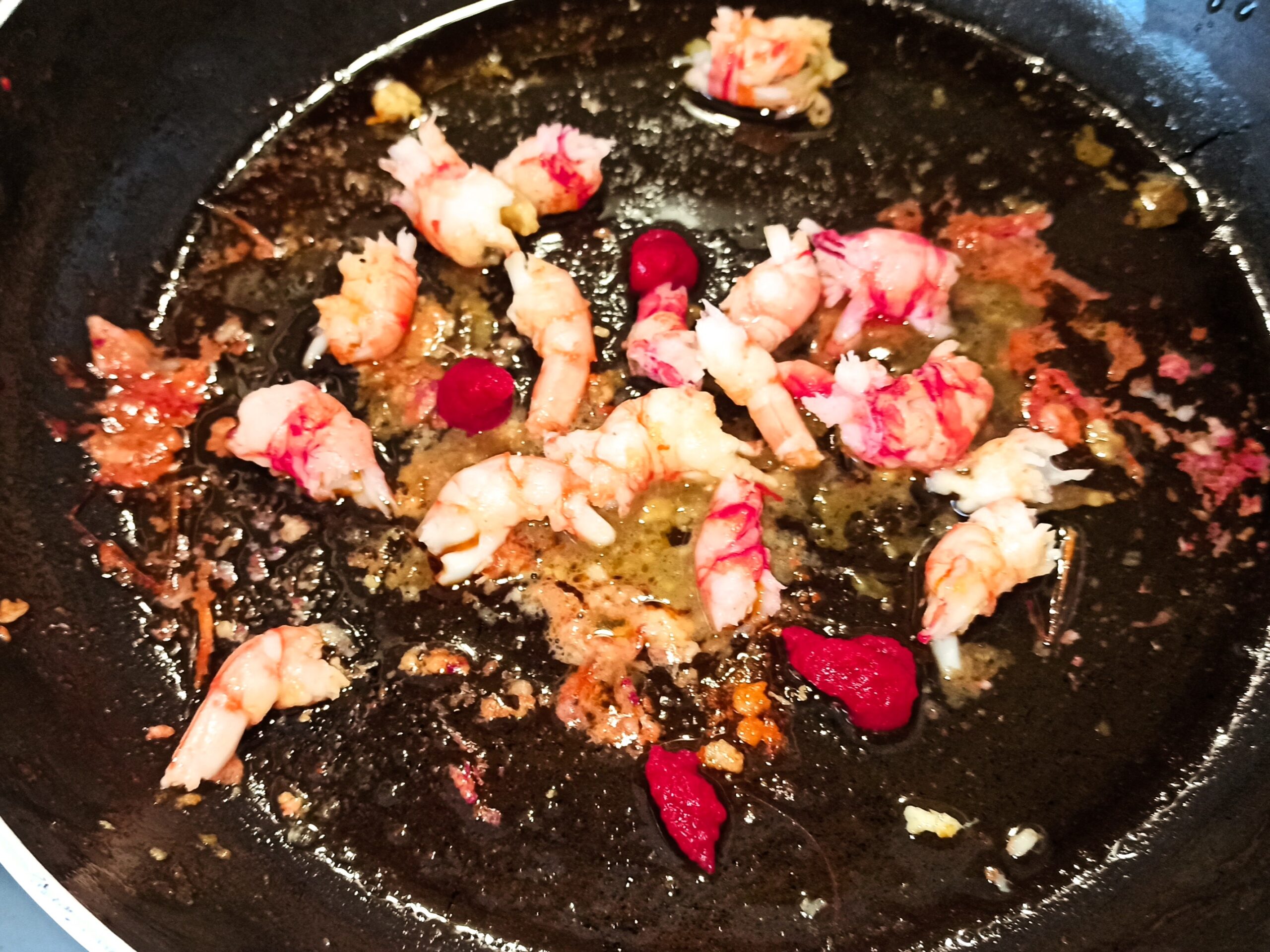 Sfumate con il brandy, lasciate evaporare. Separate la teste dal corpo, schiacciatele con l’aiuto di uno schiacciapatate, direttamente nella padella, conservatene un paio interi per guarnire il piatto. Eliminate il carapace, e tagliate in tre i gamberi, aggiungeteli nella padella, insieme ad un cucchiaino di concentrato di pomodoro e mescolate il tutto.