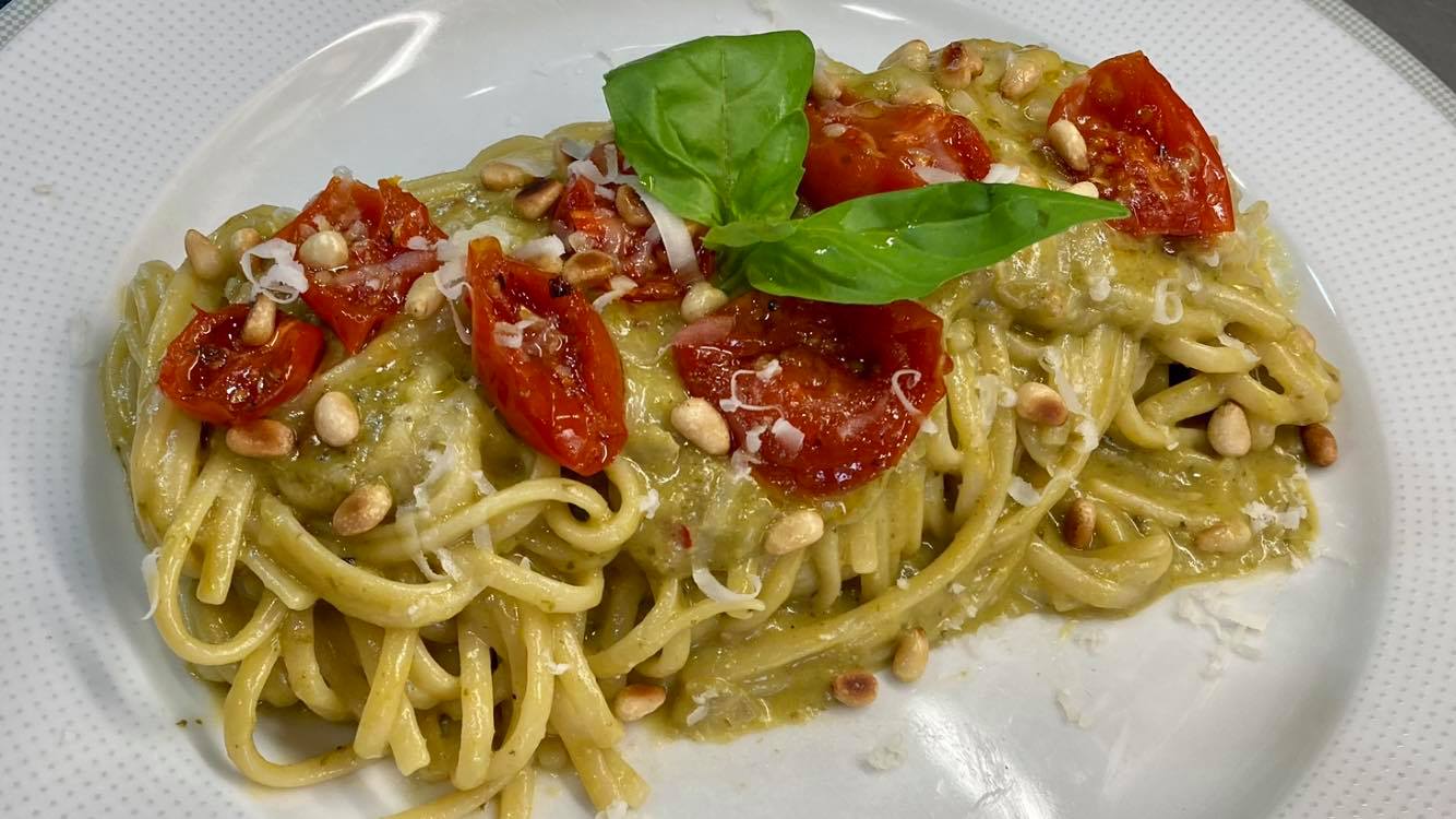Linguine pesto, pomodorini e pinoli