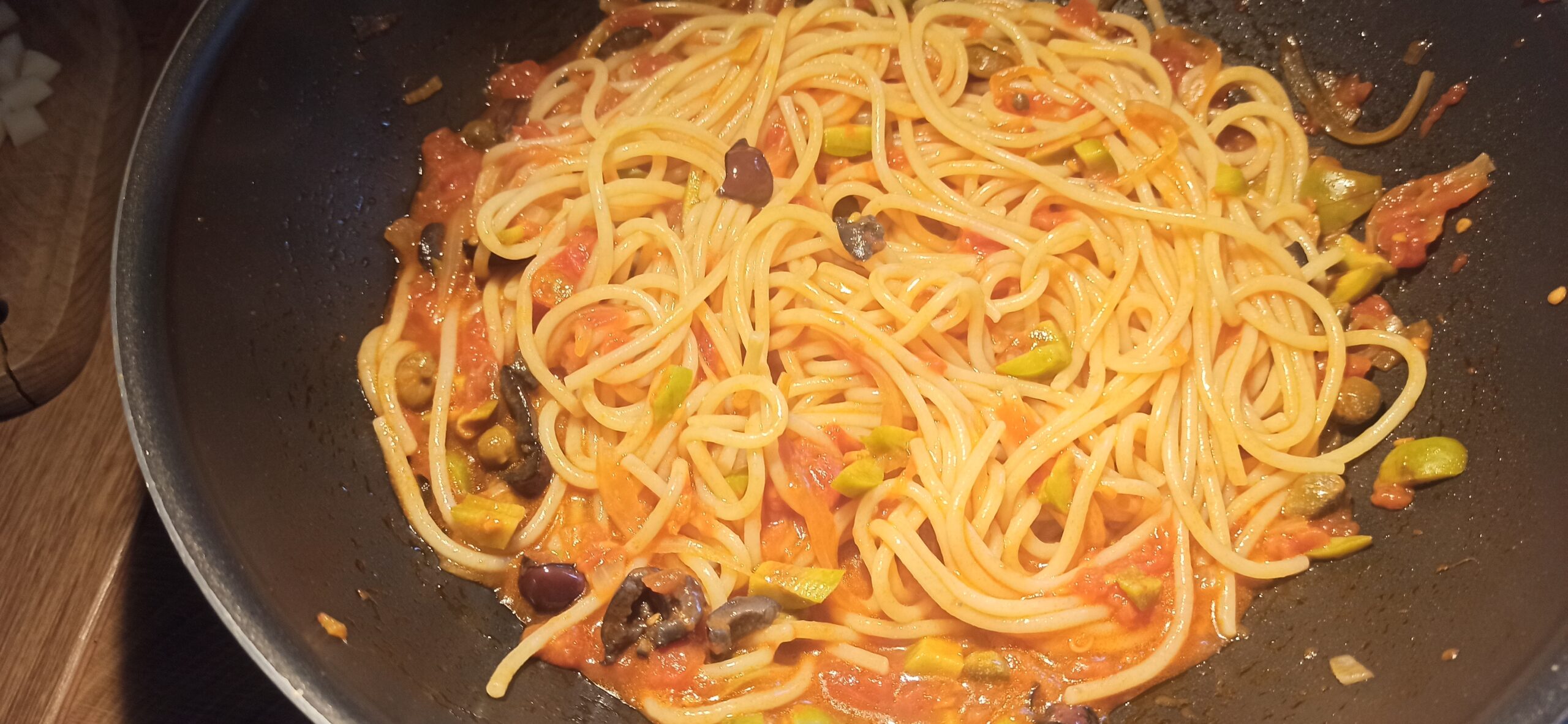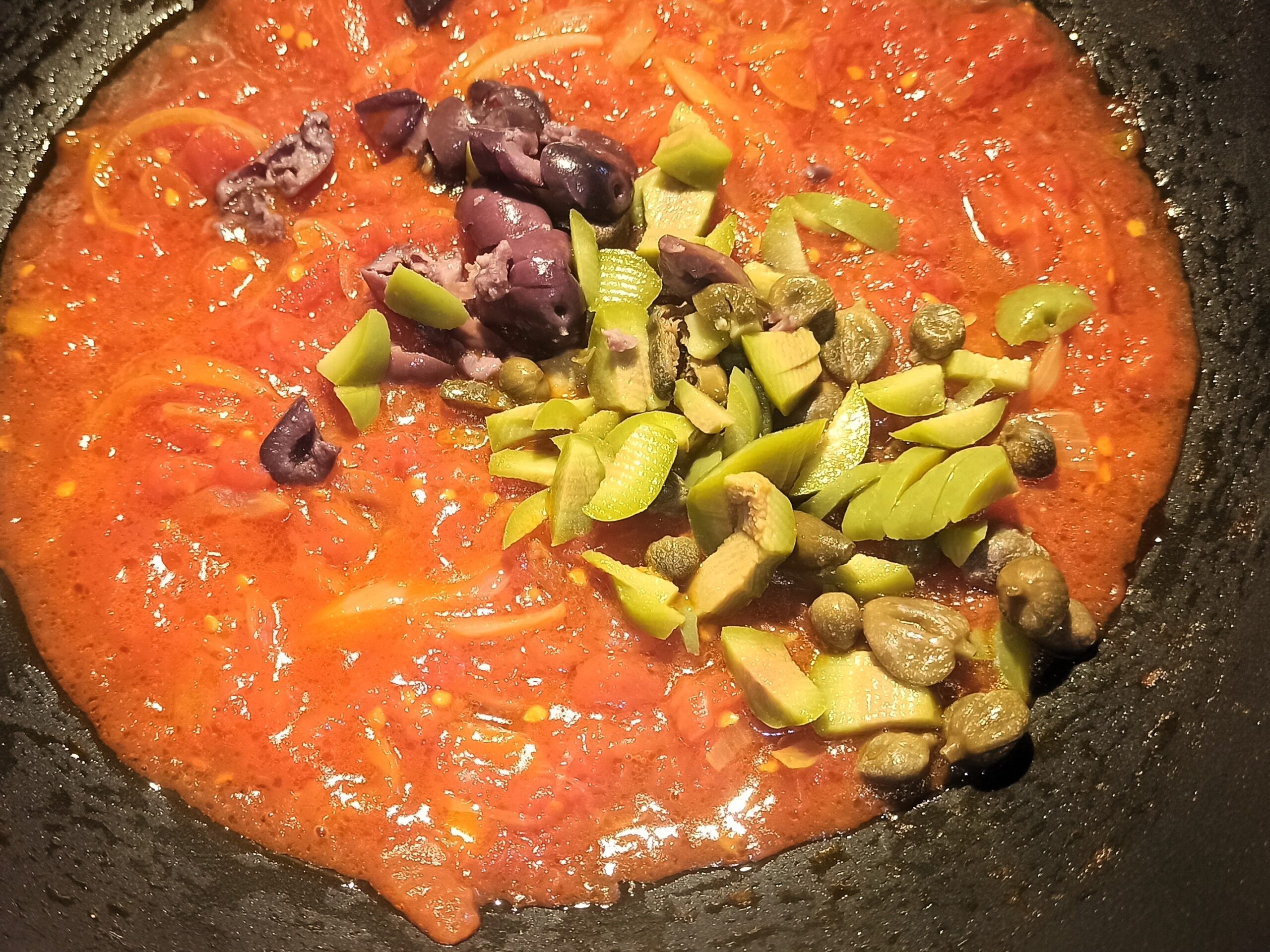 Mescolate, fate cuocere per dieci minuti a fiamma bassa. Nel frattempo che la salsa cuoce, denocciolate le olive, e tagliatele grossolanamente insieme ai capperi. Aggiungete il trito ai pomodori, lasciate insaporire il sugo per qualche minuto, se occorre regolate di sale.