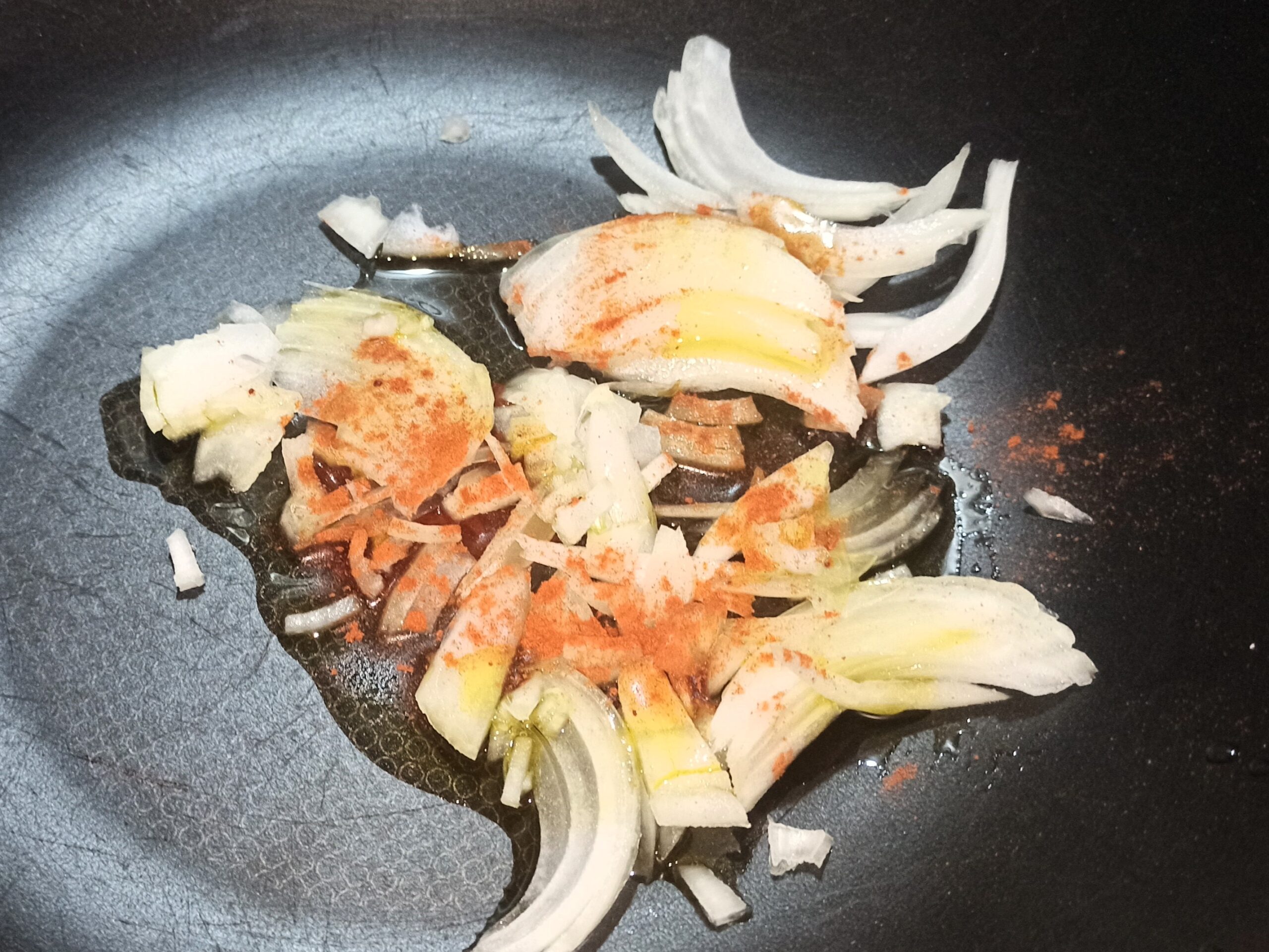 Mettete un giro d’olio evo in una capiente padella, poi aggiungete la cipolla e la polvere di peperoncino.