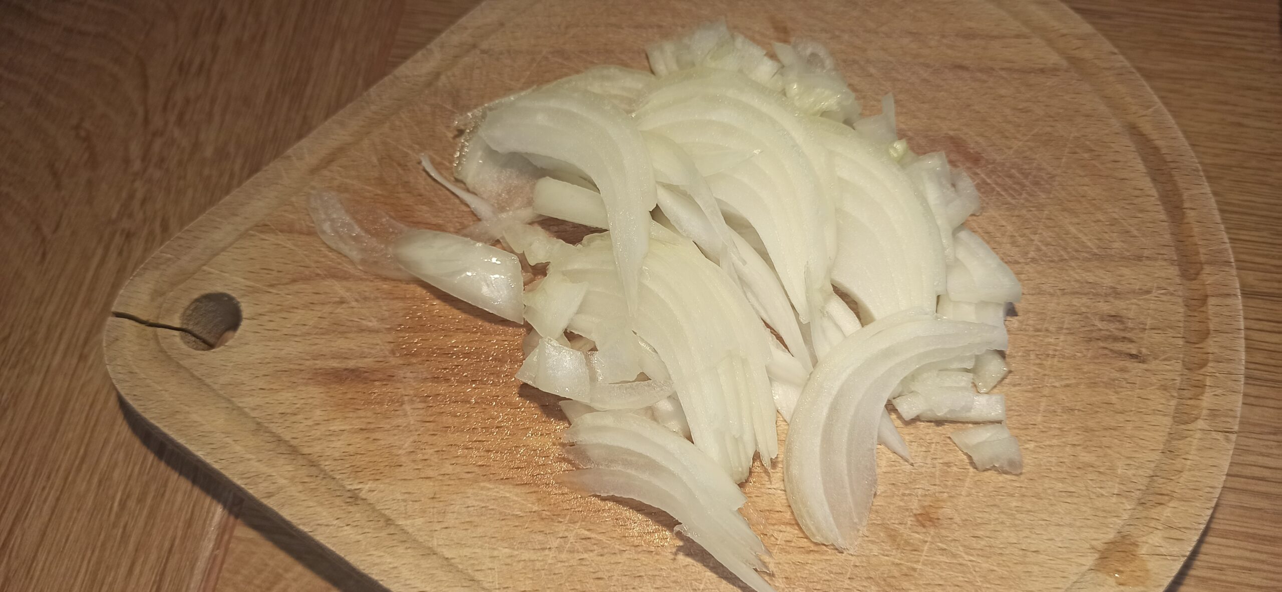 Per preparare gli spaghetti alla vesuviana, iniziate ad affettare la cipolla.