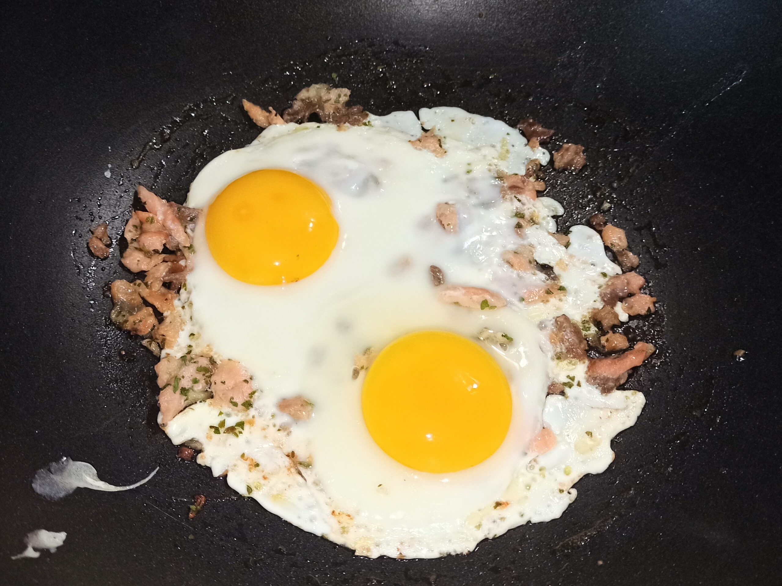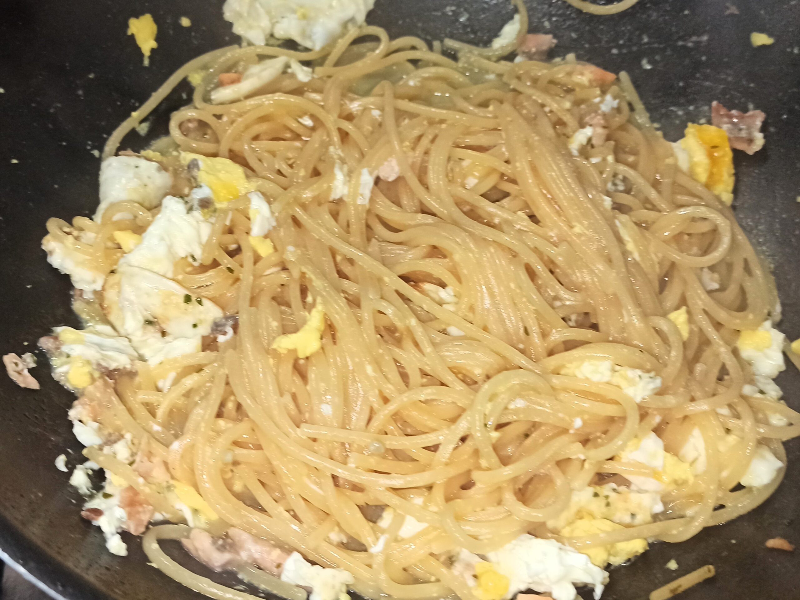 Nel frattempo cuocete al dente la pasta in abbondante acqua salata. Due minuti prima di colare la pasta, aggiungete le uova nella padella, fatele cuocere giusto per due minuti.