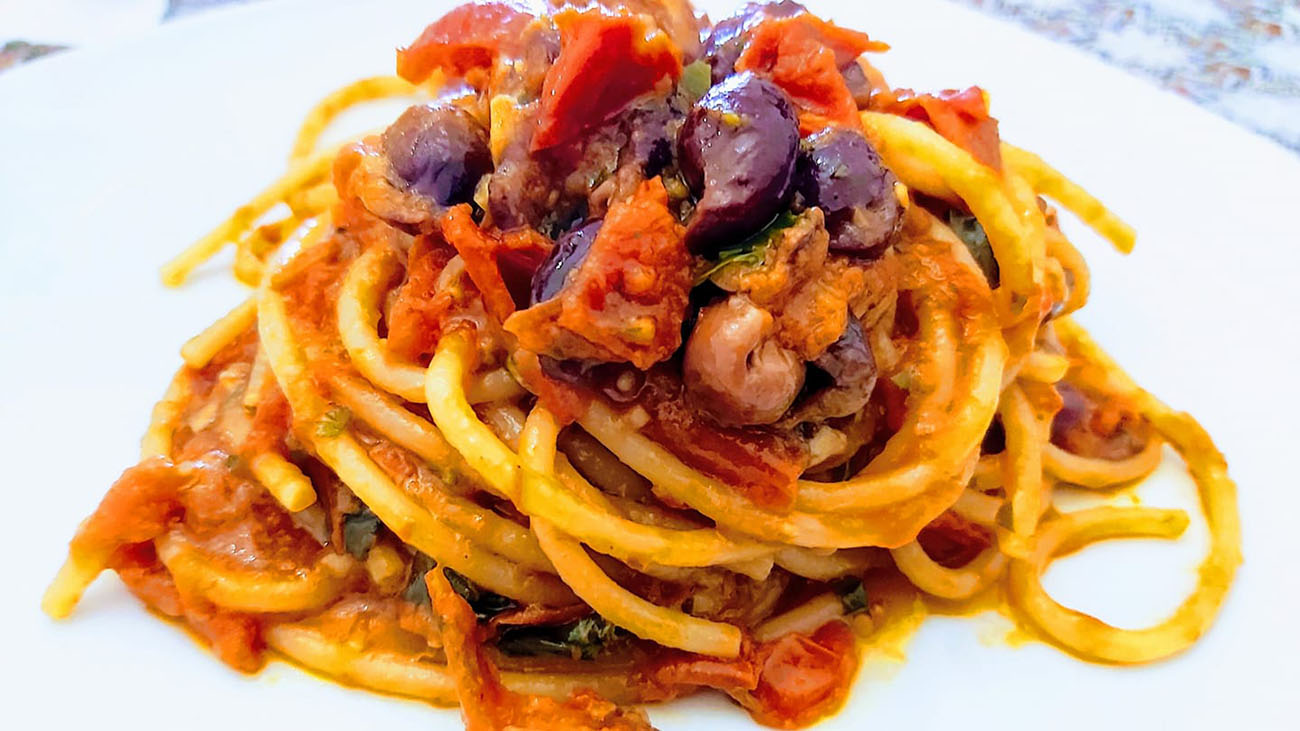 Oggi vi presento una gustosa variante dei classici spaghetti alla puttanesca, di origine campana: la puttanesca con tonno. In questa ricetta, le acciughe tradizionali sono state sostituite con il tonno sott’olio, conferendo al piatto un sapore leggermente diverso. Vengono utilizzati pomodoro, olive nere, cipolla e peperoncino per un soffritto saporito, il tutto decorato con un po’ di prezzemolo. La preparazione è così facile e veloce che potete realizzare questo delizioso piatto all’ultimo minuto, poco prima di servire a tavola! Come formato di pasta è sempre preferibile quello lungo: spaghetti, spaghettoni o linguine. Provateci!