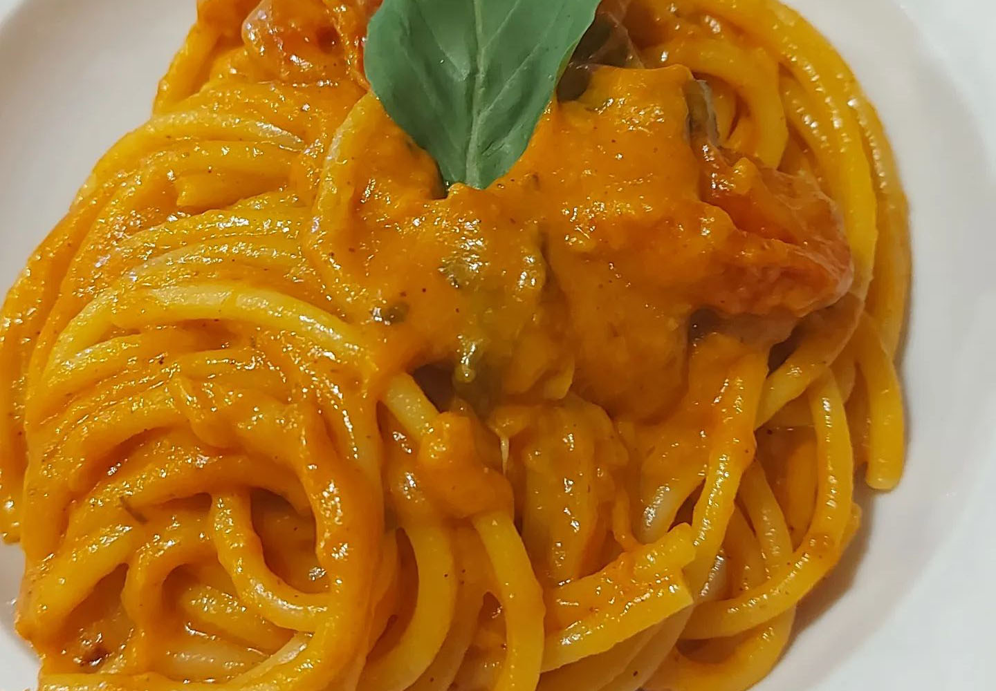 Poi, fate cuocere gli spaghetti. Una volta cotti, scolateli e versateli in una padella con la salsa di e mantecate il tutto per bene. Successivamente, posizionate gli spaghetti a forma di “tubo” al centro del piatto e condite con la salsa di pomodoro. Disponete i pomodorini confit ripieni sopra, aggiungete 2-3 cucchiai di pesto al basilico e spolverate con la polvere di pomodoro. Buon appetito! Leggi anche: Spaghetti alla Saponara, più veloci dell’aglio e olio. Così buoni che Edoardo De Filippo gli dedicò una poesia, li preparava in 5 minuti