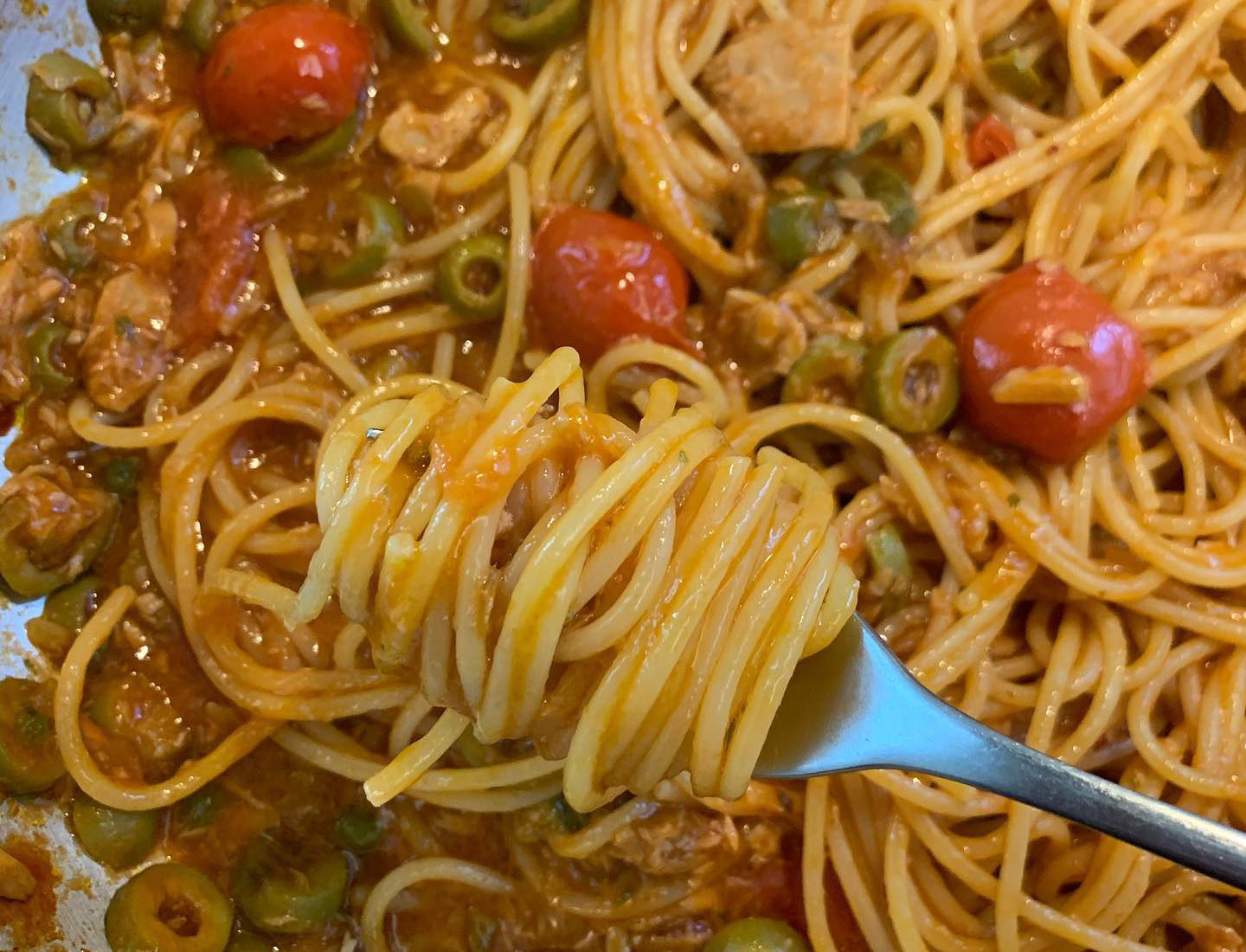 Intanto avete calato la pasta in abbondante acqua bollente. Quando gli spaghetti saranno quasi cotti, potete aggiungere i filetti di tonno al sughetto. Spezzettateli per bene e lasciateli amalgamare con gli altri ingredienti. Scolate la pasta molto al dente e trasferitela direttamente nella padella con il condimento. Unite anche un po’ di acqua di cottura e un giro di olio extravergine di oliva a crudo. In questo modo il risultato sarà molto più cremoso. Fate saltare il tutto per qualche minuto, quindi impiattate. I vostri spaghetti alla zingarella sono pronti. Buon appetito.