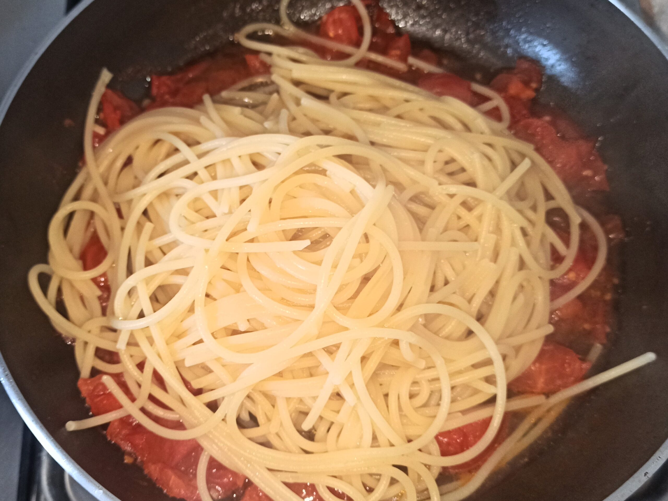 Cuocete la pasta al dente e colatela direttamente nella padella, amalgamate e spadellate per un paio di minuti.