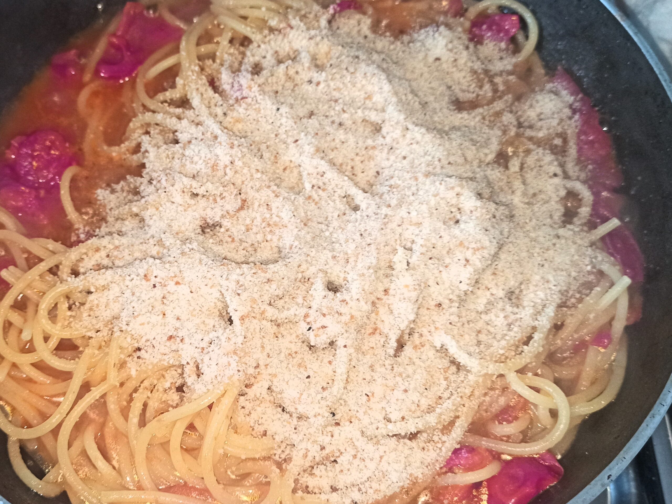 Spegnete la fiamma, aggiungete la colatura di alici, ed il pane grattugiato.