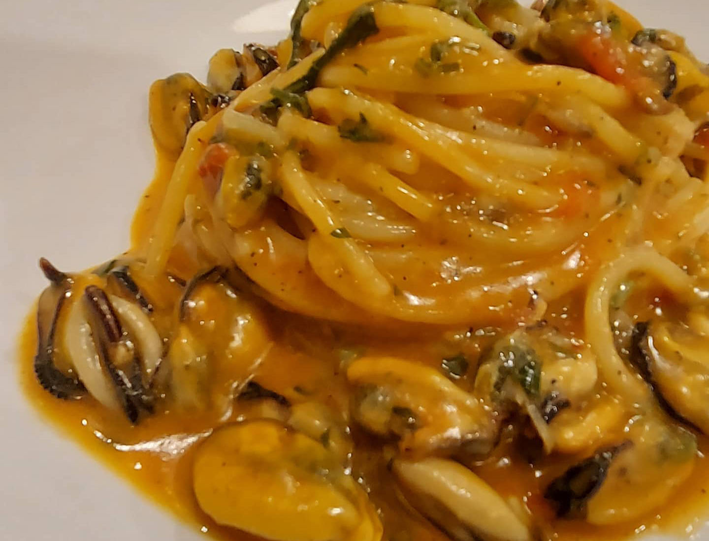 Iniziate lavando accuratamente i pomodorini e tagliandoli a metà. In una padella ampia, fate un soffritto con uno spicchio d’aglio in tre cucchiai d’olio evo. Poi, aggiungete le cozze pulite e coprite con un coperchio. Cuocete per circa 5 minuti o fino a quando le cozze si saranno aperte. Una volta aperte, rimuovetele dalla padella, sgusciatele e mettetele da parte. Nel frattempo, portate l’acqua a ebollizione per cuocere gli spaghettoni al dente.