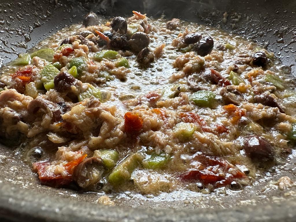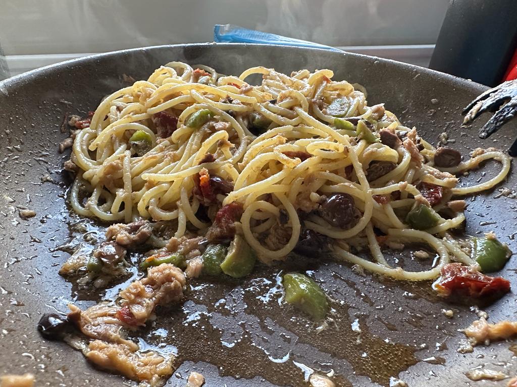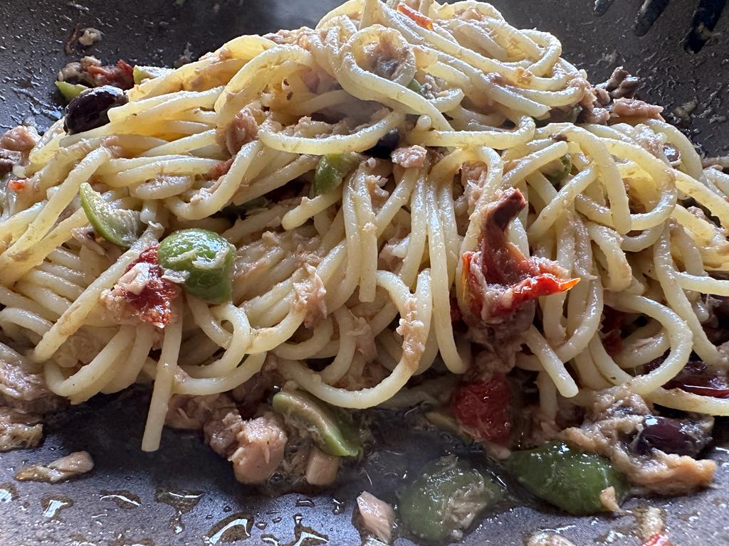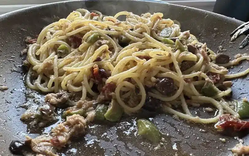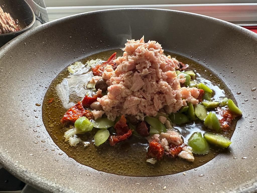 Tritate grossolanamente i pomodori secchi appena sbollentati e le olive denocciolate. Dissalate bene i capperi sotto l’acqua corrente. Unite tutto nella padella con il tonno e la cipolla. Aggiungete un mestolino di acqua di cottura della pasta (ricca di amido) e mescolate energicamente per creare un sughetto legato e non slegato.