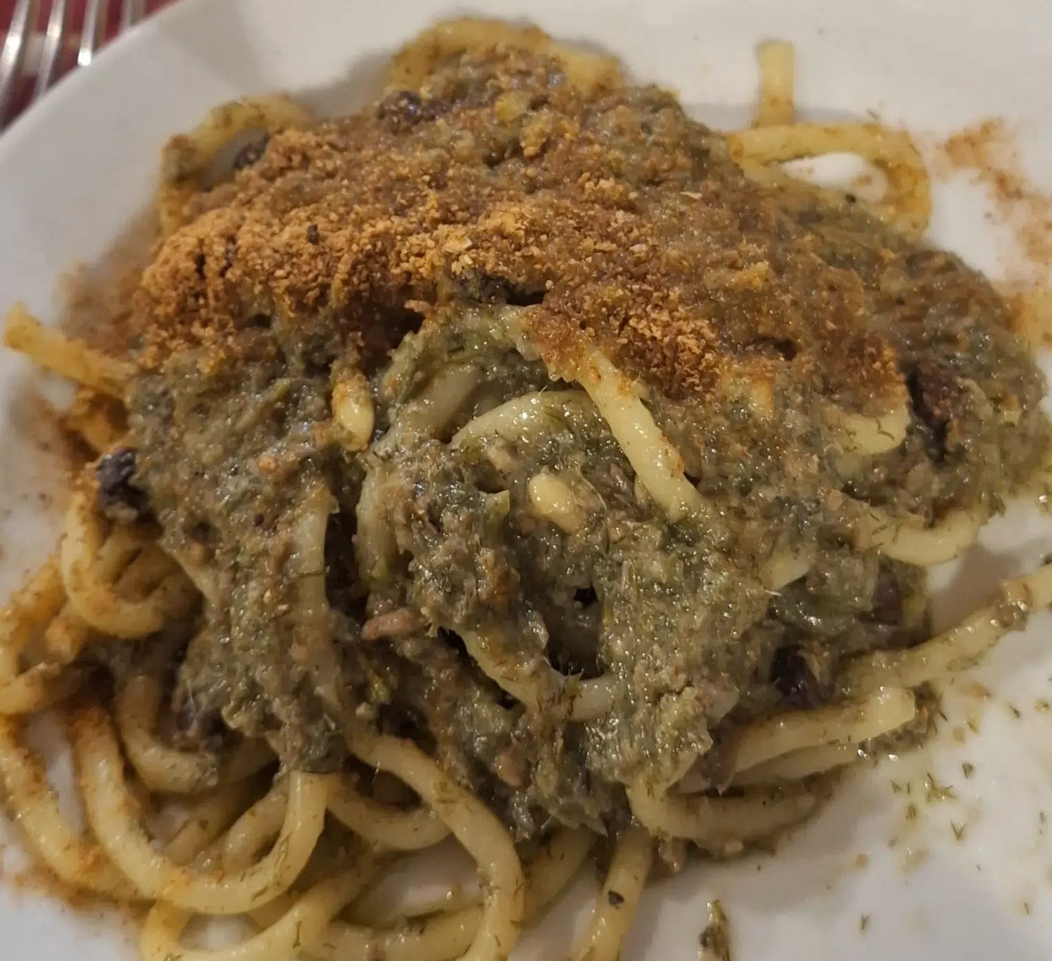 Serviamo le busiate ben calde, completando ogni piatto con una generosa spolverata di pangrattato tostato. A piacere, possiamo aggiungere un filo d’olio extravergine d’oliva a crudo per esaltare i sapori.