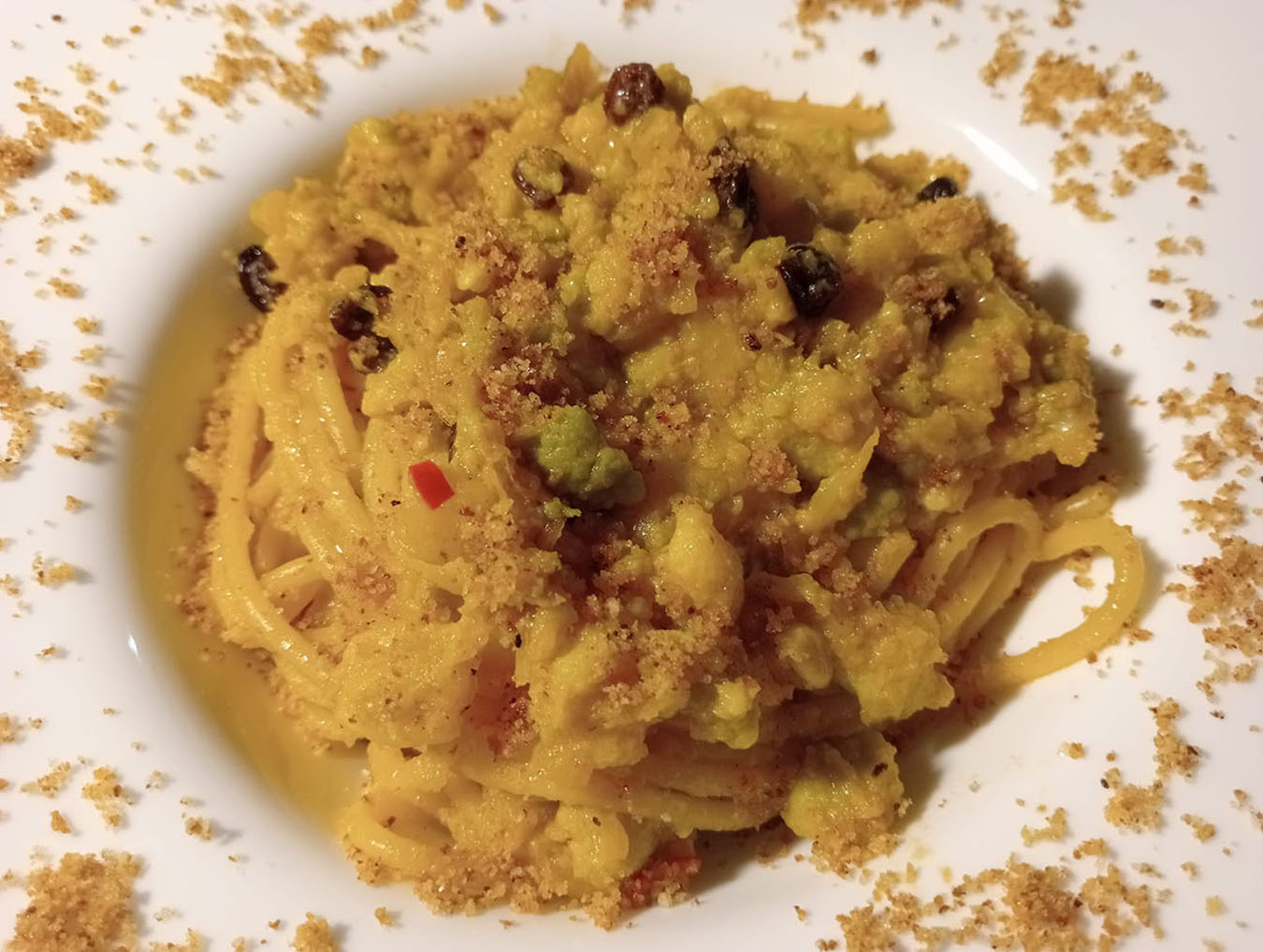 Unite la bustina di zafferano, facendola sciogliere con l’acqua di cottura del broccolo, e lasciate cuocere. Lessate i bucatini nell’acqua in cui avete cotto il broccolo e scolateli al dente. Trasferiteli nella padella con i broccoli, saltateli e terminate la cottura in padella per un minuto a fiamma alta. Servite il vostro piatto spolverando abbondantemente con pan grattato abbrustolito e, se preferite, un po’ di parmigiano grattugiato. Buon appetito!