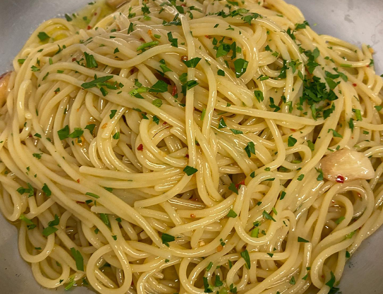 Unite anche il prezzemolo. Completate la cottura della pasta direttamente in padella. Se necessario, aggiungete altra acqua di cottura, poca alla volta, come se doveste risottarla. Il risultato finale deve essere cremoso e succoso. Aggiustate di sale e impiattate. Condite con un giro di olio extravergine in superficie. I vostri spaghetti con aglio olio e peperoncino sono pronti. Buon appetito. Accompagnateli con un buon vino rosso e vedrete che bontà.