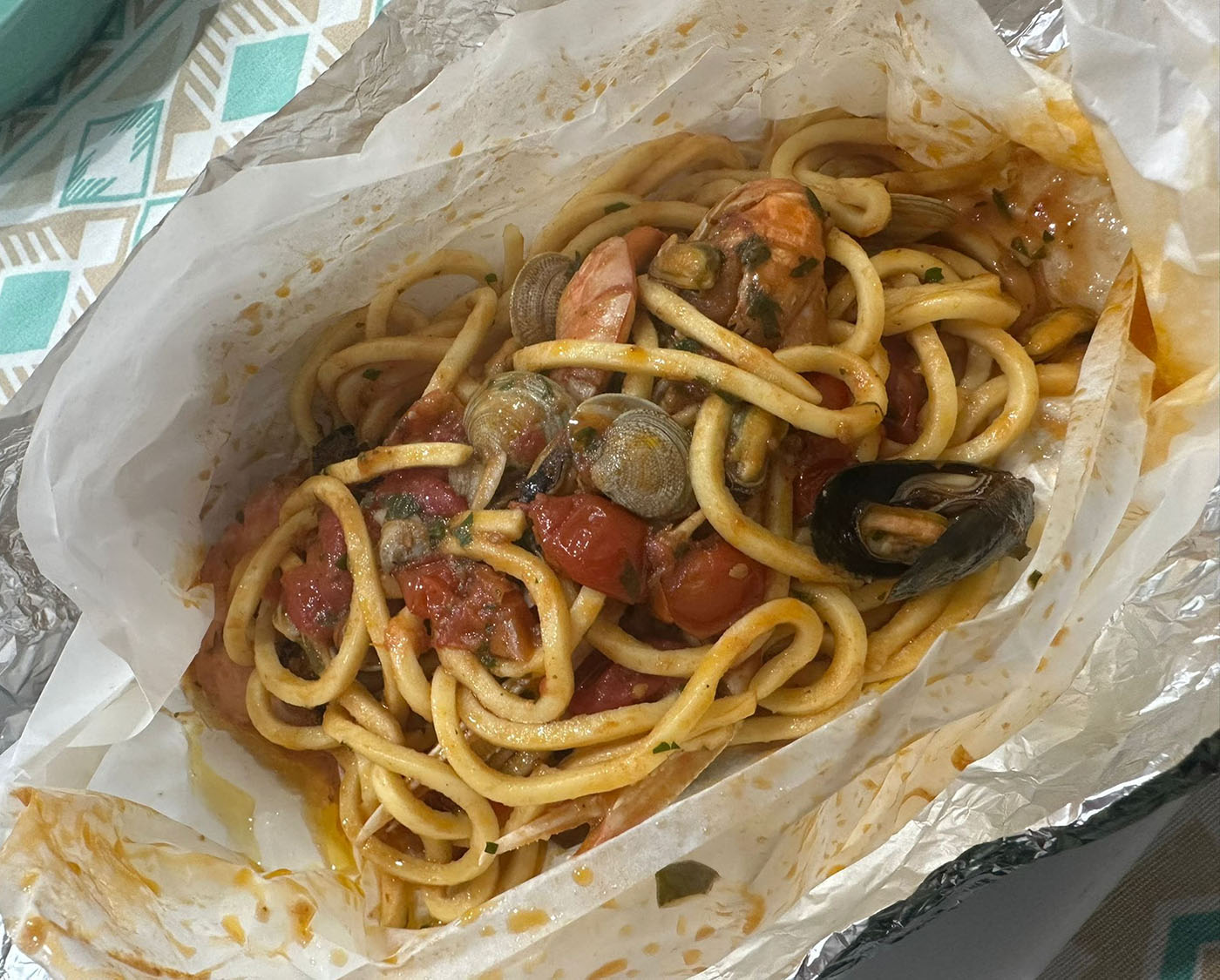 Aggiustate di sale e pepe e fate insaporire. Unite anche le vongole precedentemente sgusciate e i gamberi, anche questi sgusciati. Scolate gli spaghetti bene al dente e trasferiteli nella padella con il condimento. Spolverate con basilico e prezzemolo tritati e coltello e fate saltare il tutto. Rivestite una teglia con della carta da forno e trasferite la pasta al suo interno. Richiudete il cartoccio e fate cuocere a 180 gradi per 5 minuti. Travasatelo direttamente sul piatto da portata, aprite leggermente e servite. I vostri spaghetti con frutti di mare al cartoccio sono pronti. Buon appetito.