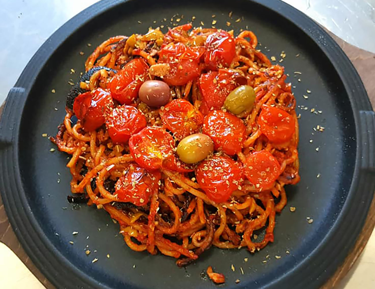 Nel frattempo, cuocete gli spaghetti in abbondante acqua salata, seguendo i tempi di cottura indicati sulla confezione. Una volta pronti, scolateli e uniteli direttamente nella padella con il sugo di olive e pomodori. Aggiungete un pizzico di peperoncino a piacere e mescolate bene, in modo che la pasta si insaporisca e si colori uniformemente. Spegnete il fuoco e aggiungete qualche foglia di basilico fresco per dare un tocco di freschezza al piatto. Servite immediatamente, magari con una fetta di pane pugliese per raccogliere il delizioso sughetto rimasto nel piatto. I vostri spaghetti con le olive fritte alla barese sono pronti.