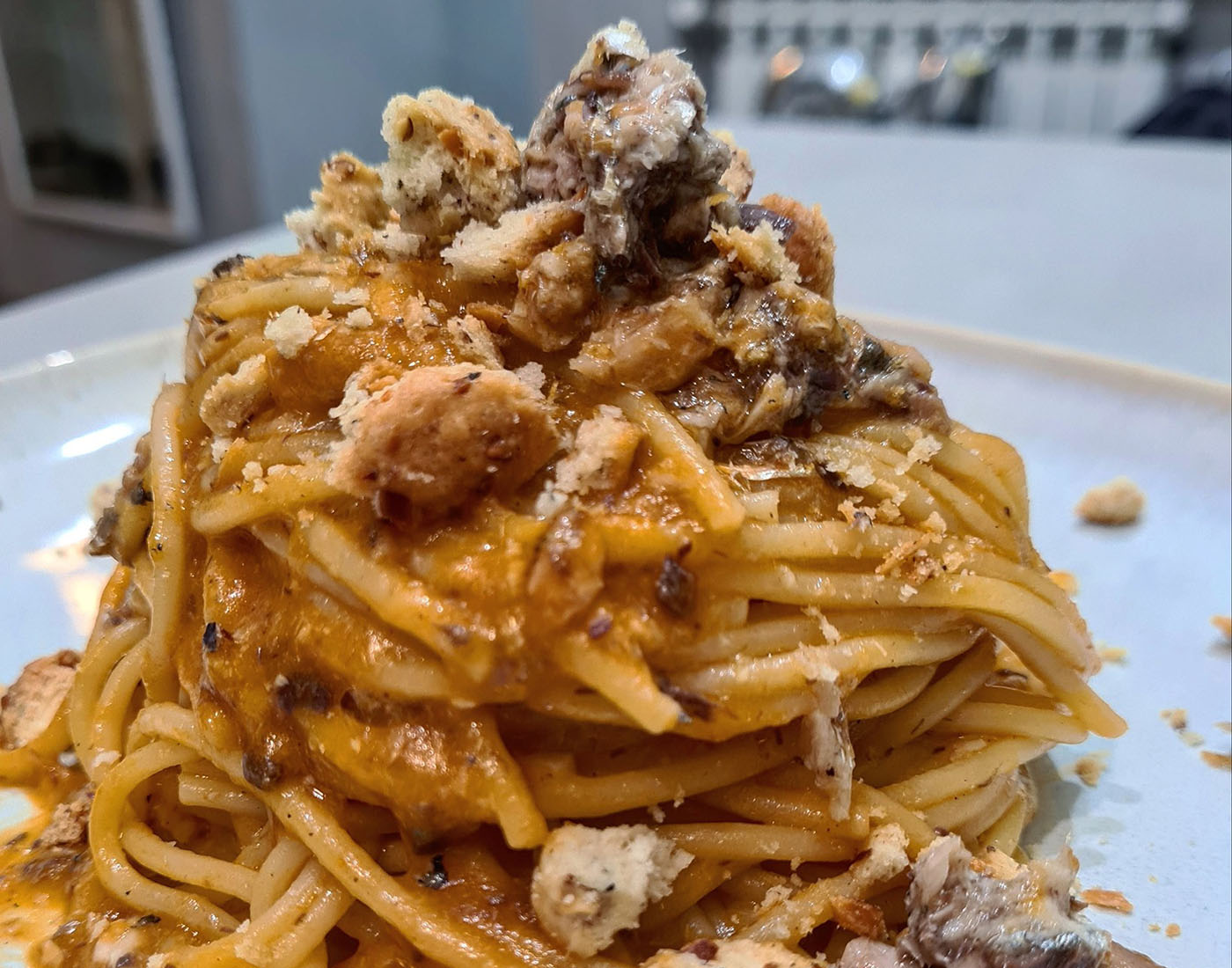 La prima cosa da fare per preparare gli spaghetti con le sarde è pulire il pesce. Sciacquatele sotto l’acqua corrente, sfilettatele e tagliatele a pezzi. Tritate finemente la cipolla. In padella scaldate un giro di olio extravergine di oliva e fate rosolare la cipolla e l’aglio. Quando gli odori saranno bene appassiti, unite le sarde e lasciate rosolare per 5 minuti. Sfumate con il vino bianco. Quando la parte alcolica sarà completamente evaporata, unite la polpa di pomodoro e il peperoncino.
