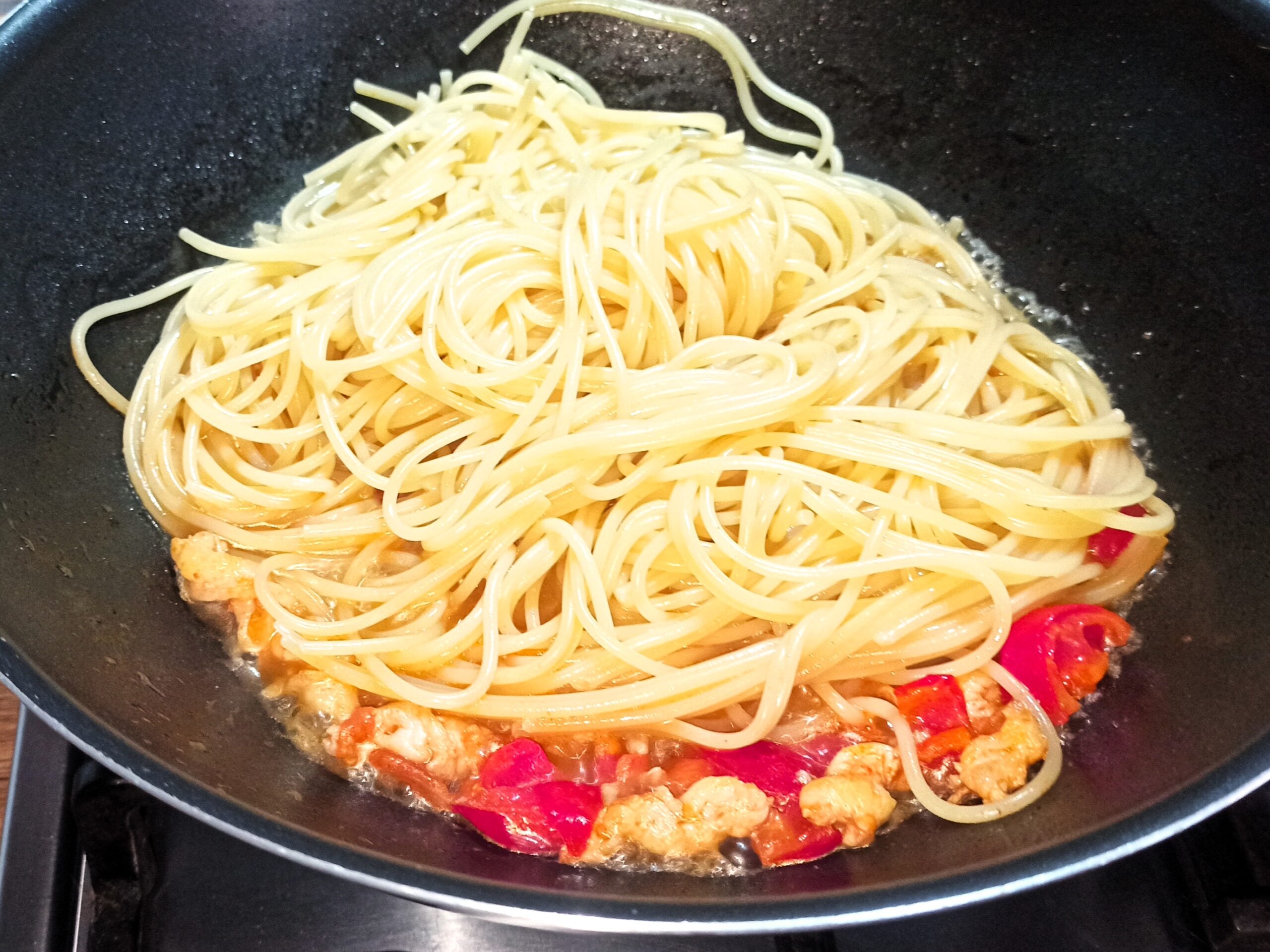 Cuocete la pasta in abbondante acqua salata, colateli direttamente nella padella, sette minuti prima della fine della cottura, e continuate la cottura aggiungendo il brodo preparato con gli scarti degli scampi.