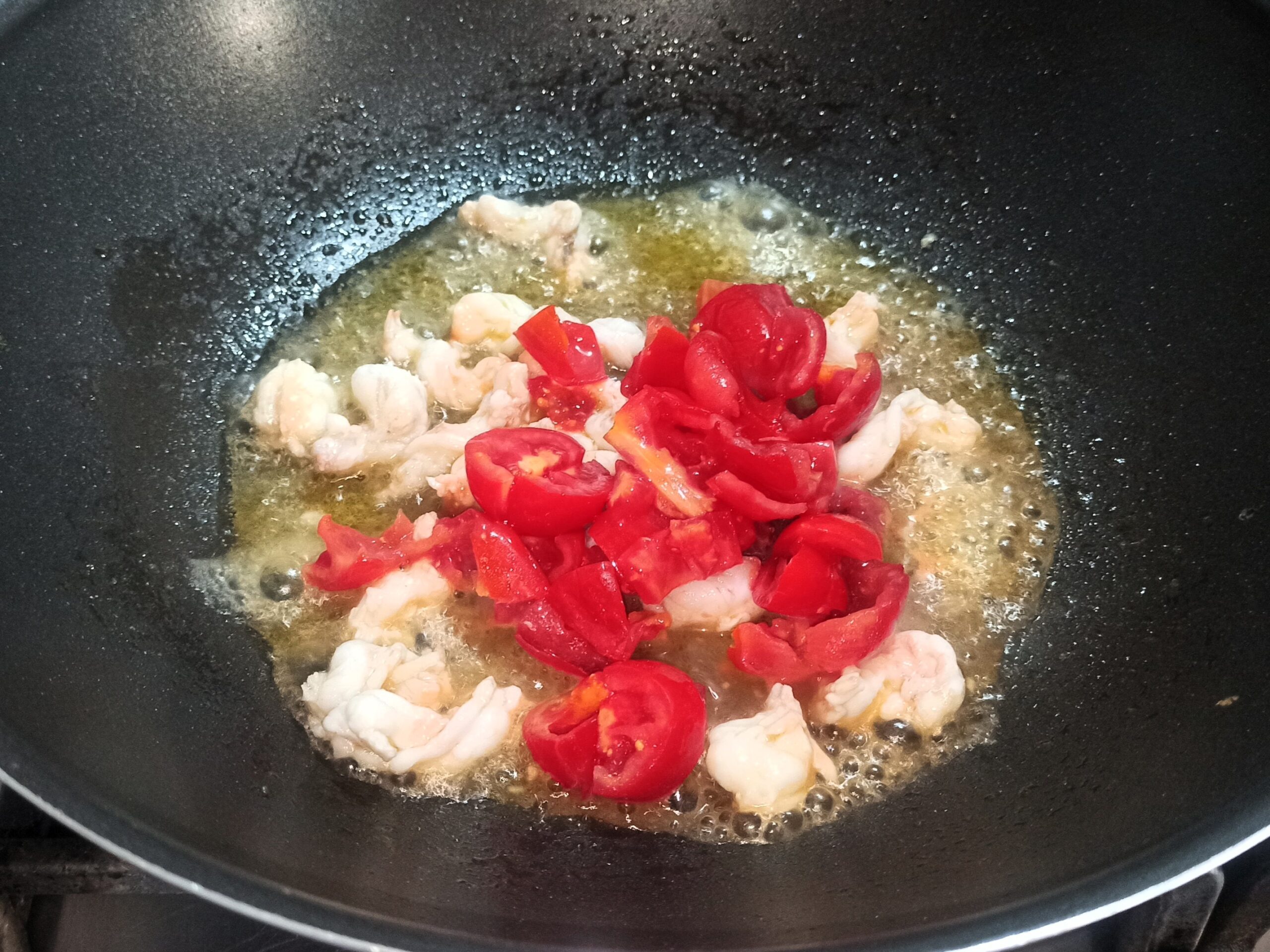 Fate evaporare l’alcol aggiungete i pomodorini tagliati in quattro, regolate di sale e fate cuocere per cinque minuti.