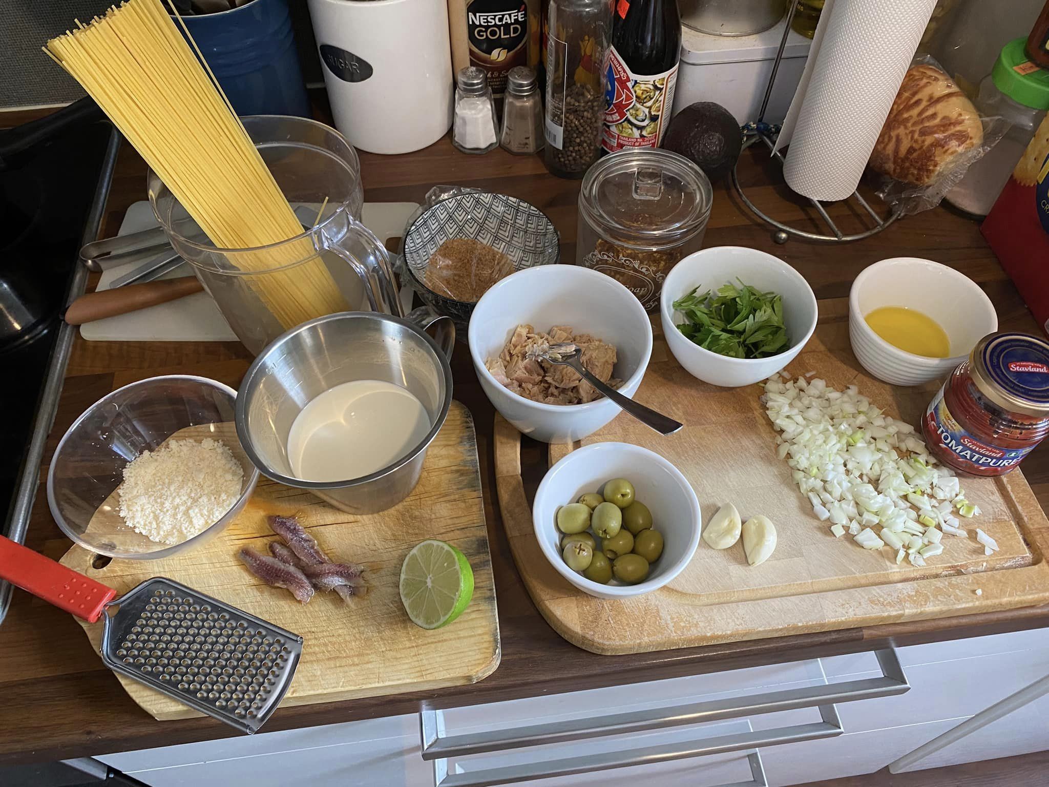 Abbiamo tagliato finemente le acciughe, le olive a rondelline, spezzettato il tonno e conservato un po’ del loro olio. Inseriamo il tonno e gli altri ingredienti in padella, mescoliamo, versiamo un filo di quell’olio conservato, spruzziamo un poco di limone, aggiustiamo di sale e pepe senza esagerare, e mescoliamo. Cuociamo qualche minuto prima di inserire gli spaghetti gia’ scolati. Mescoliamo, saltiamo gli spaghetti insaporiamo e spegniamo il fuoco. Spolveriamo con del prezzemolo, impiattiamo spolverando con il parmigiano. Buon appetito.