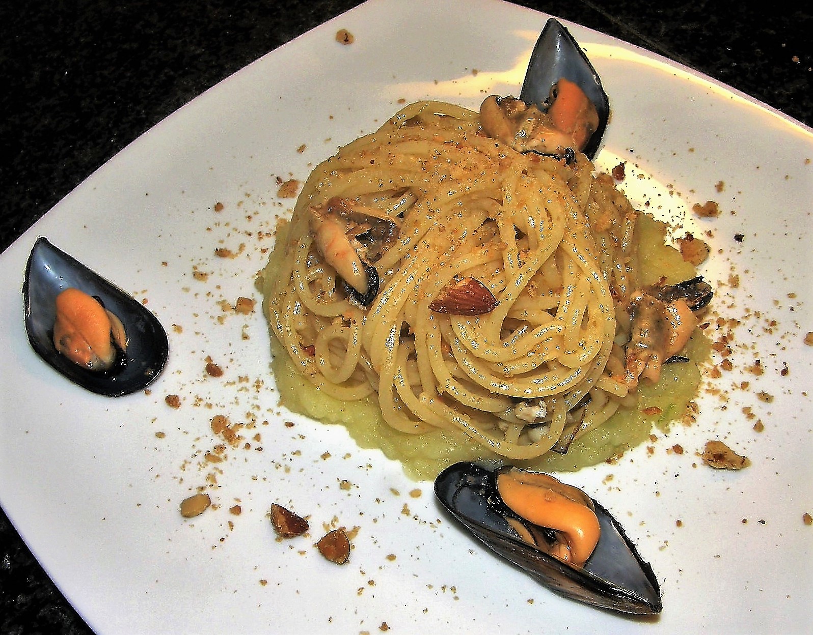 Spaghetti con le cozze e crema di patate