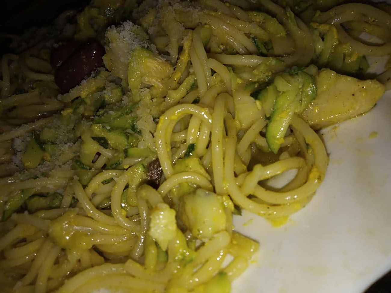 Nel mentre, fate cuocere al dente gli spaghetti. Quando saranno cotti, scolateli e versateli nella padella col condimento. A fiamma bassa, mescolate ed amalgamate per bene, aggiungendo un altro po’ d’olio evo. Infine, impiattate e, prima di servire, fate una bella spolverata di parmigiano. Buon appetito! Leggi anche: Spaghetti aglio e olio completamente a crudo super cremosi solo con la marinatura. Pronti in 5 minuti senza padella