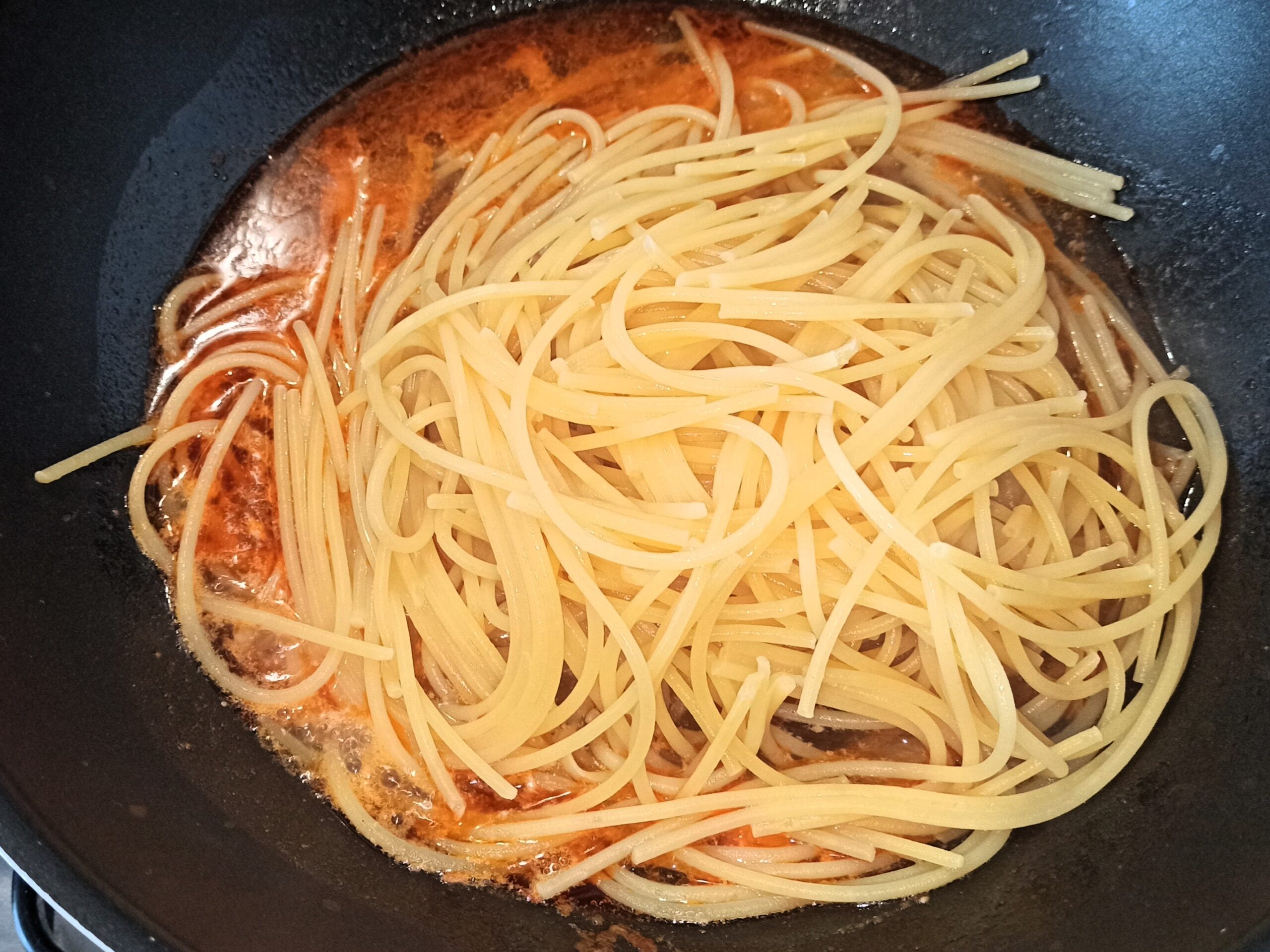 cuocete la pasta per metà del tempo, riportato sulla confezione, colatela nella padella, e continuate la cottura, aggiungendo acqua a bisogno.