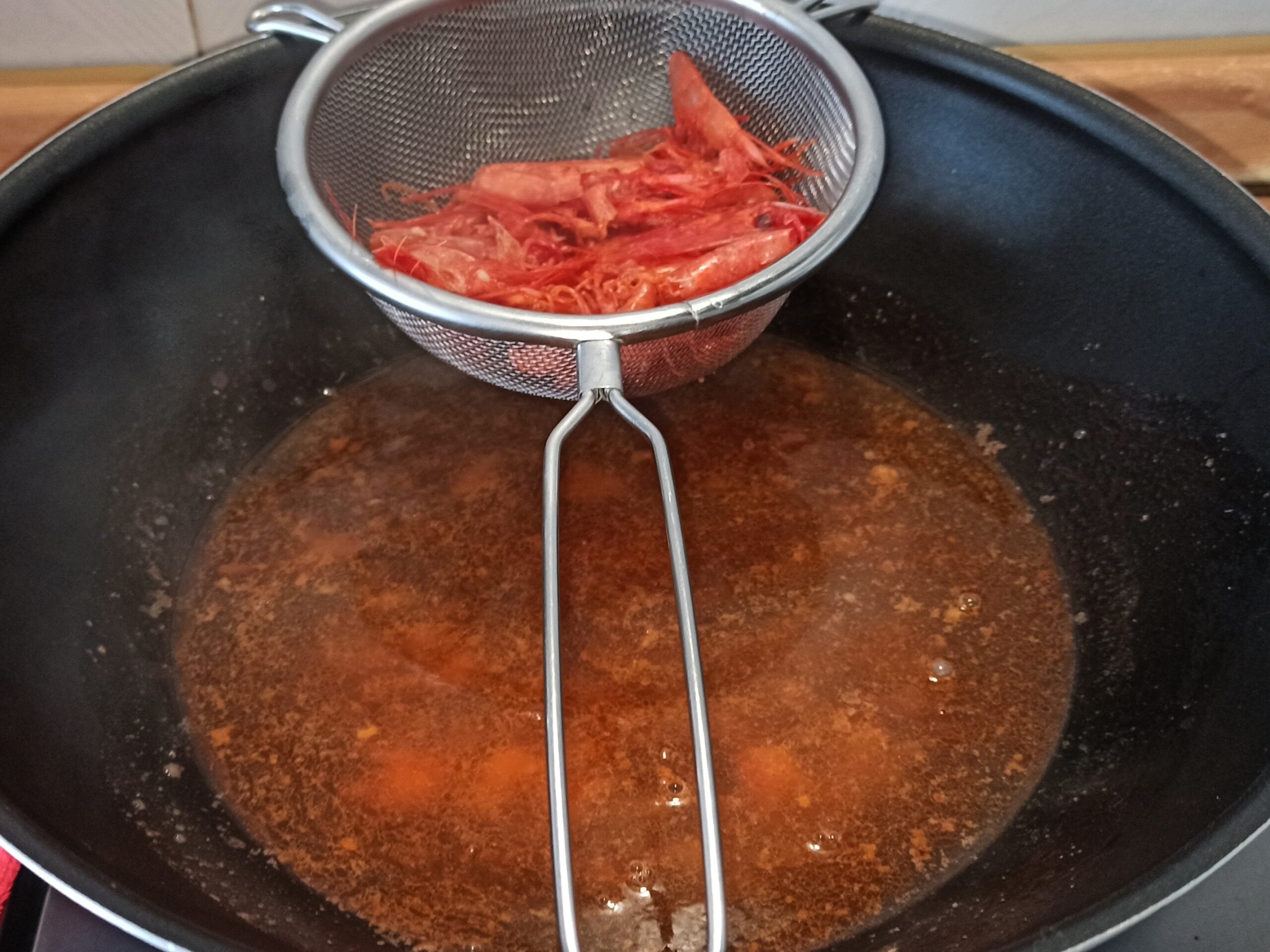 In una capiente padella, mettete un paio di giri abbondanti di olio evo, aggiungete lo spicchio d’aglio, e fatelo imbiondire leggermente ed eliminatelo. Nello stesso olio fate cuocere per un minuto per lato i gamberi interi, sfumate con il brandy, e mettete da parte. Filtrate il brodetto, direttamente nella padella,