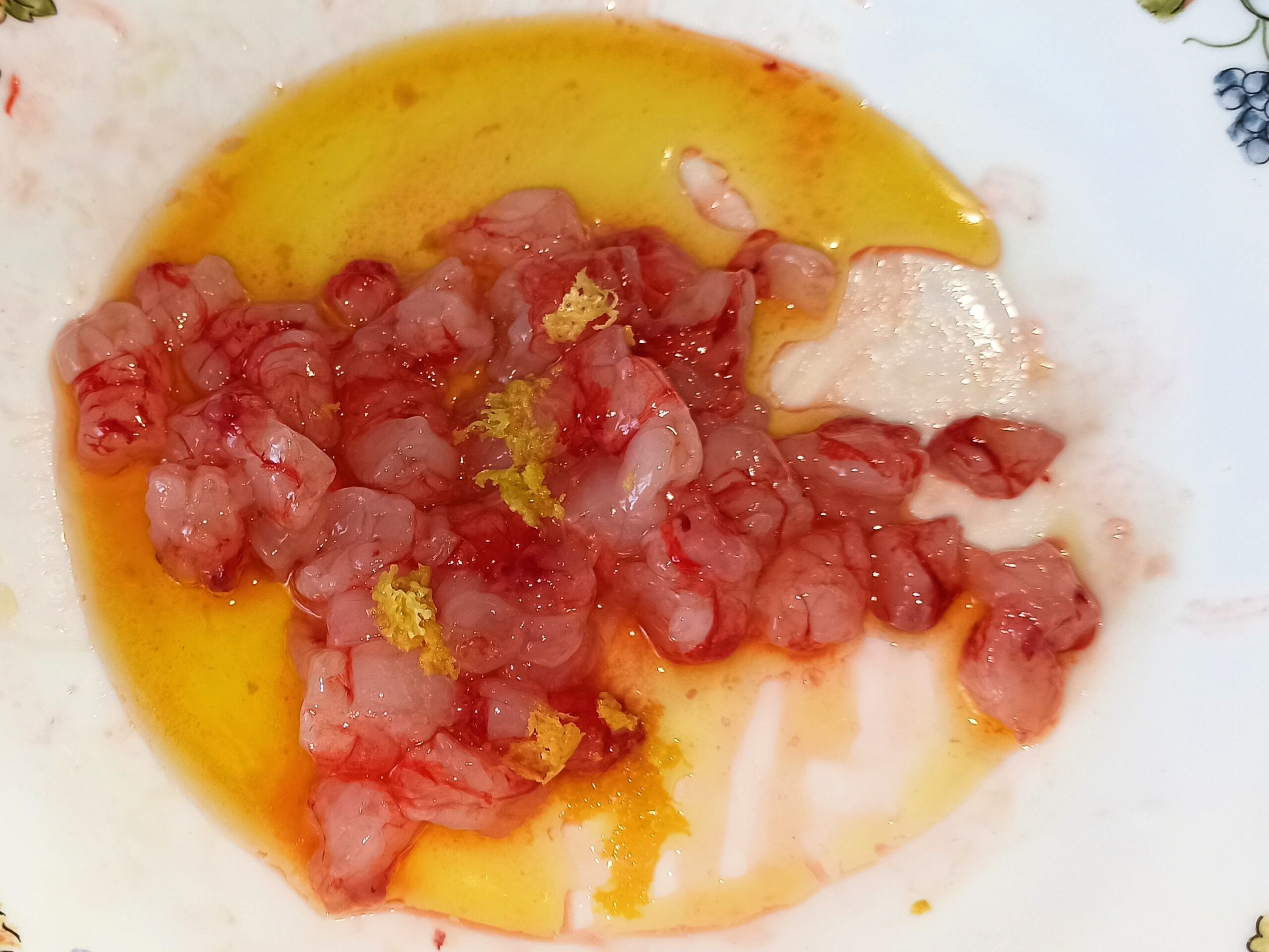Nel frattempo eliminate il filo nero dai gamberi, tagliateli in quattro, metteteli in una ciotolina, aggiungete un filo d’olio, il succo di mezzo limone e un pizzico di sale, mescolate e fate riposare in frigo per circa trenta minuti.