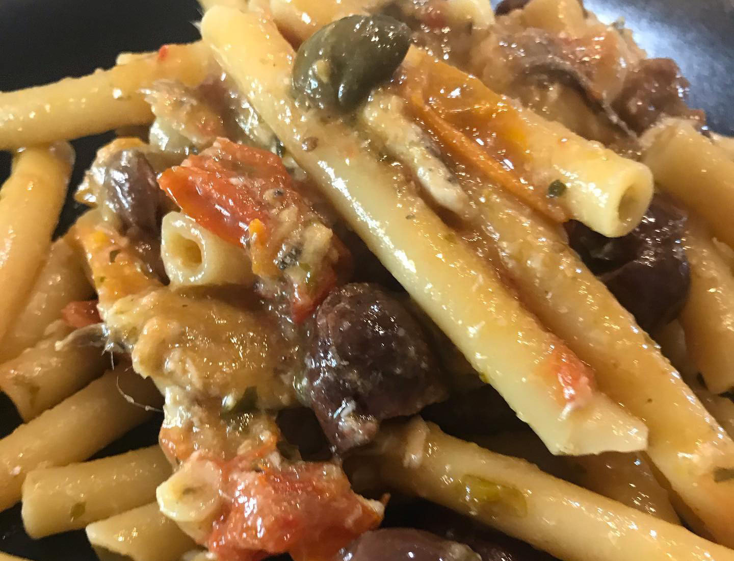 Intanto potete calare la pasta. Mentre aspettate che cuoce, denocciolate le olive nere e tagliatele a rondelle. Trascorso il tempo di cottura del sugo, aggiungete tutti gli aromi e le olive. Lasciate insaporire per qualche minuto. Scolate la pasta al dente e aggiungetela alla padella con il condimento. Fate saltare il tutto per amalgamare bene gli ingredienti. Impiattate e completate con una bella spolverata di parmigiano reggiano grattugiato. La vostra pasta del pirata è pronta. Leggi anche: Spaghetti di Sant’Agata, il primo catanese più veloce dell’aglio e olio con il tonno in scatola. L’antica ricetta della nonna siciliana