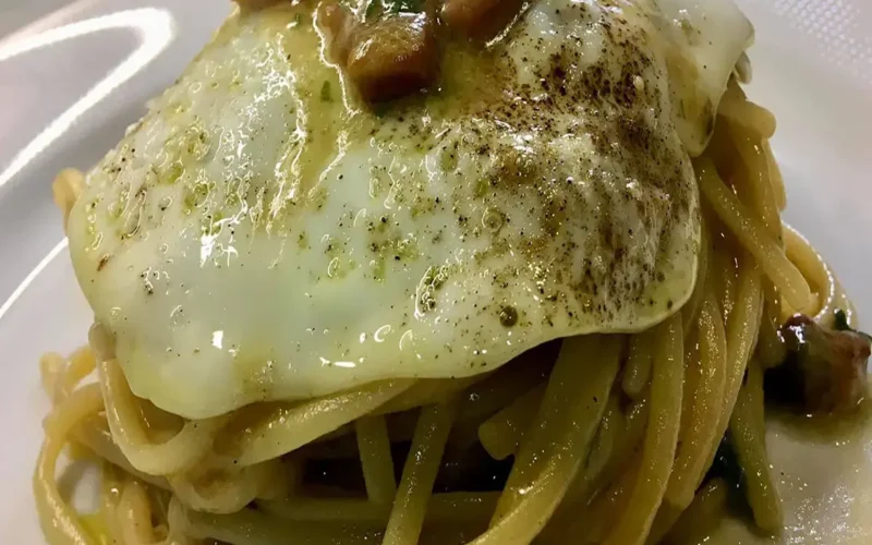 Completare il piatto : Scola gli spaghetti e trasferiscili nella padella con le uova e la pancetta. Mescola delicatamente per rompere i tuorli e distribuire l’uovo su tutta la pasta, creando una consistenza cremosa. Aggiusta di pepe e sale a piacere. Infine Servire : Distribuisci gli spaghetti nei piatti, assicurandoti che ciascuno abbia il proprio “occhio di bue”. Cospargi con abbondante formaggio grattugiato e servi ben caldo. Ecco pronti i vostri spaghetti al puveriello risagliuto! Un piatto semplice ma ricco di sapore, che sfida il suo nome e conquista tutti al primo assaggio.