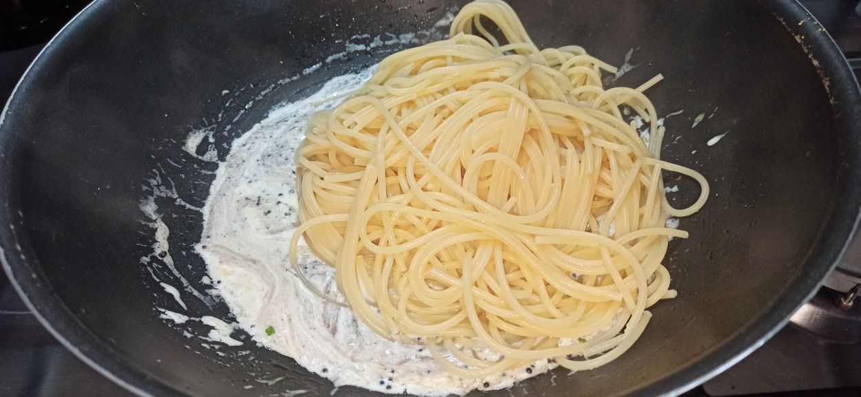 Mescolate bene, e se occorre regolate di sale. Cuocete la pasta al dente, colatela direttamente nella padella,