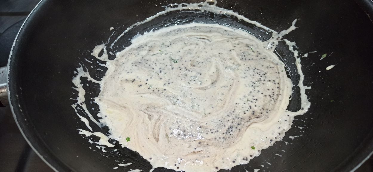 Appena la cipolla sarà appassita, eliminatela insieme ai gambi del prezzemolo. Diminuite la fiamma al minimo, aggiungete la panna, e le foglie del prezzemolo tritate.