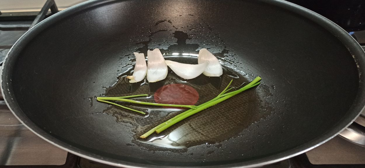 Per preparare gli spaghetti del vecchio nostromo, iniziate a mettere un paio di giri d’olio evo, in una capiente padella. Aggiungete la cipolla, ed i gambi del prezzemolo, fate sfrigolare a fiamma media.