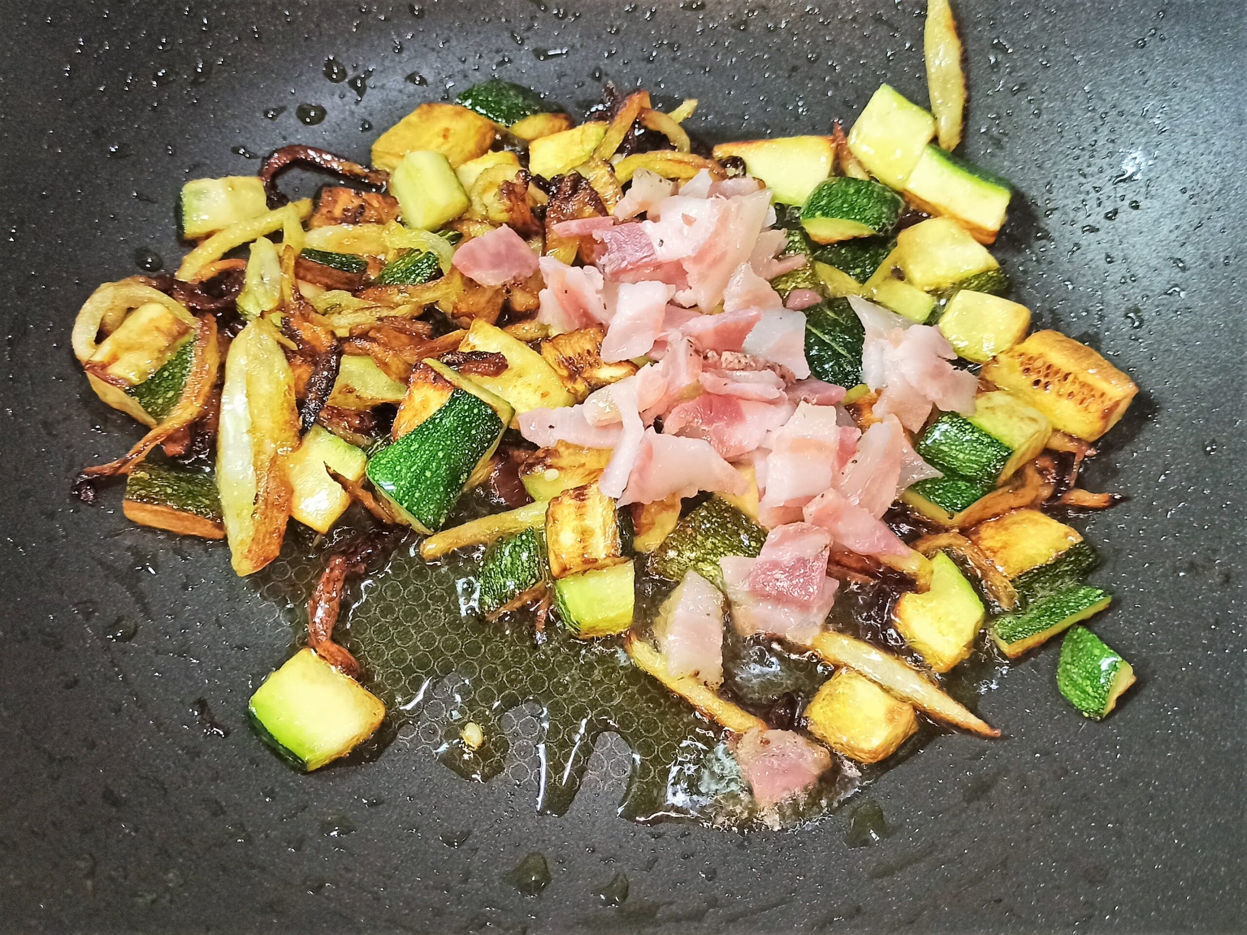 Per preparare gli spaghetti dello zio Alfio, iniziate a lavare ed asciugare le zucchine. Eliminate le due estremità e tagliatele a tocchetti. Tagliate anche la cipolla a fettine sottili e la pancetta. In una capiente padella, mettete un paio di giri abbondanti di olio evo, poi aggiungete le zucchine, ed iniziate a cuocerle a fiamma dolce. Dopo qualche minuto aggiungete le cipolle, mescolate e fate cuocere per un altro minuto, infine aggiungete la pancetta e fate rosolare bene.