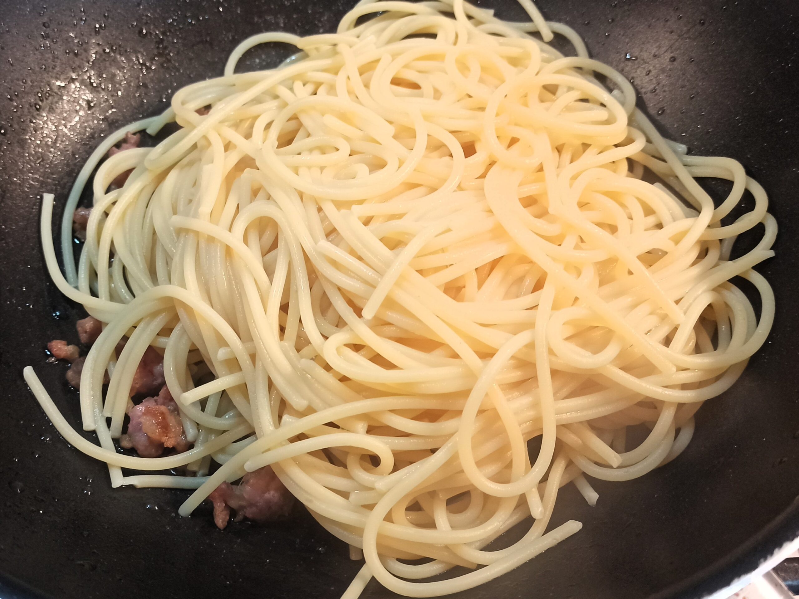Colate la pasta al dente direttamente nella padella, aggiungete un poco d’acqua di cottura, e amalgamate il tutto.