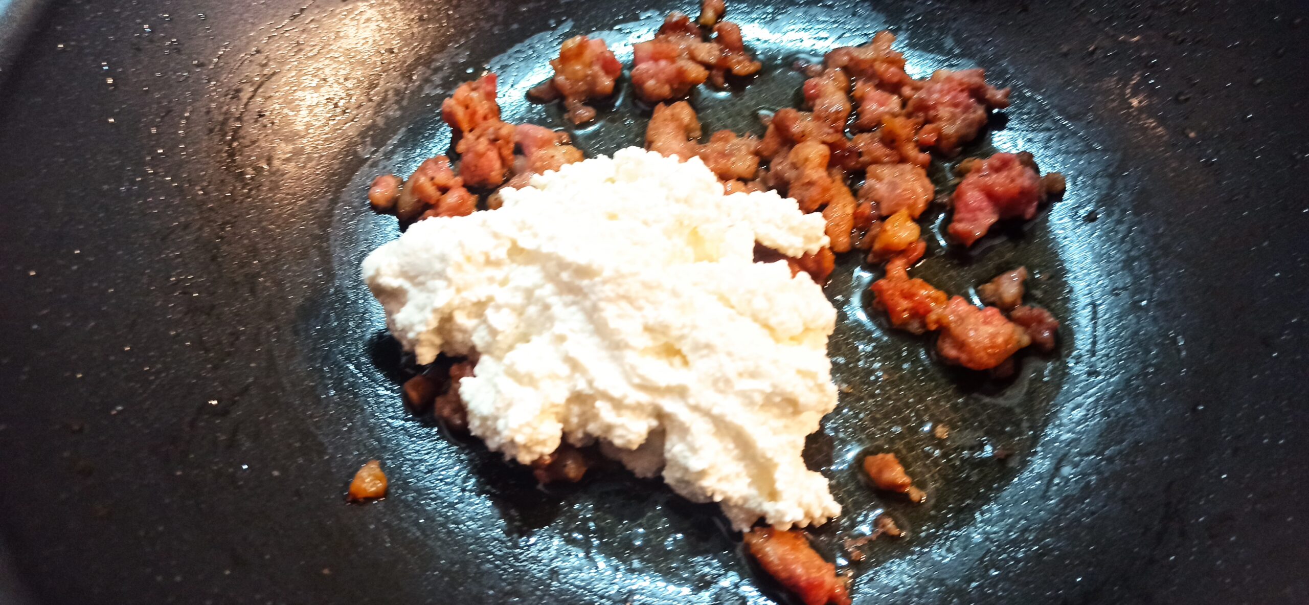 fate rosolare a fiamma media, sfumate con il vino bianco. Nel frattempo in una ciotola, mescolate la ricotta con il parmigiano, e aggiungete qualche cucchiaio di acqua di cottura della pasta e unitela alla salsiccia.