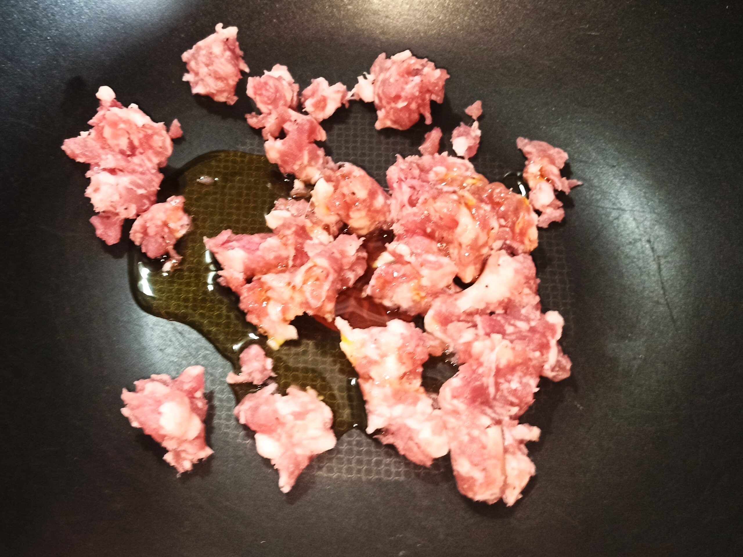 In una capiente padella, mettete un giro d’olio evo, fate imbiondire ed eliminate lo spicchio d’aglio. Aggiungete la salsiccia sbriciolata,