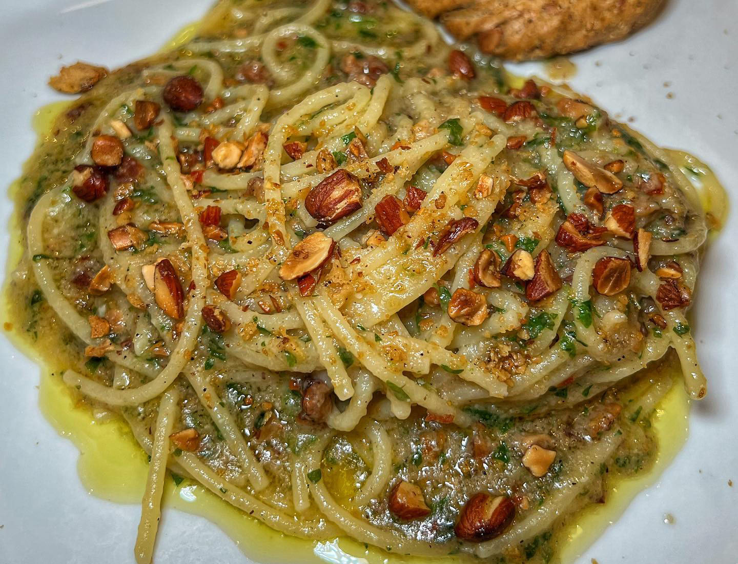 Aggiungete una generosa manciata di taralli sbriciolati e le mandorle sminuzzate nella padella. Mescolate bene e spegnete il fuoco per evitare che le briciole di tarallo e le mandorle si brucino. Un minuto prima che gli spaghetti siano pronti, riaccendete il fuoco sotto la padella e trasferitevi la pasta scolata. Spadellate insieme agli altri ingredienti, aggiungendo 2-3 cucchiai dell’acqua di cottura della pasta per creare una crema leggera con il condimento. Servite gli spaghetti in tavola, guarnendo con una spolverata di mandorle a fettine. Buon appetito! Leggi anche: Spaghetti olio e limone, Dimenticate l’aglio e olio. Il più antico piatto delle nonne napoletane con 2 ingredienti e senza cottura