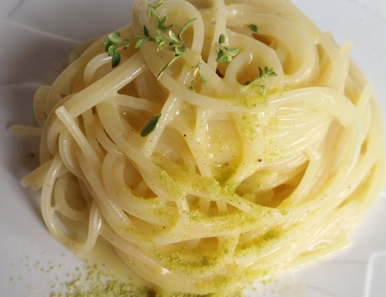 Spaghetti cremosi con olio, limone e provolone del Monaco