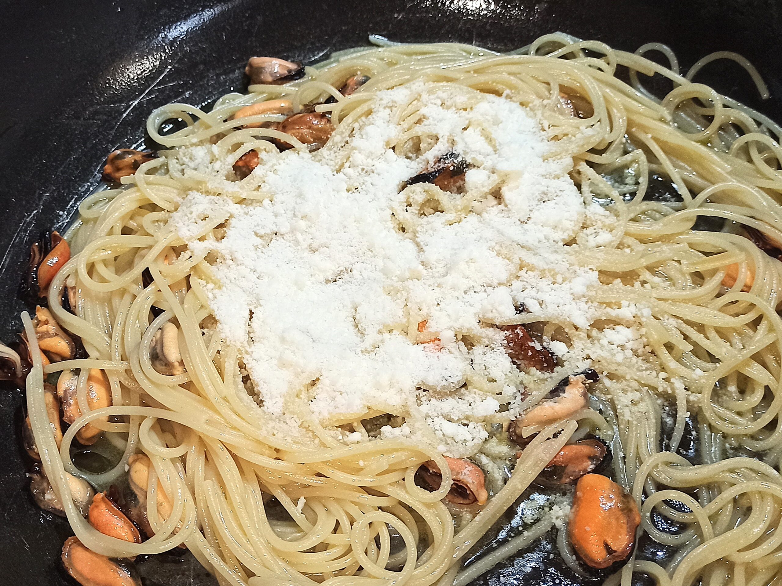 Per preparare gli spaghetti pecorino, pepe e cozze, iniziate a pulire e lavare bene le cozze. Mettete un giro d’olio evo, in una capiente pentola, aggiungete lo spicchio d’aglio, aggiungete le cozze, aumentate la fiamma, sfumate con il vino bianco.